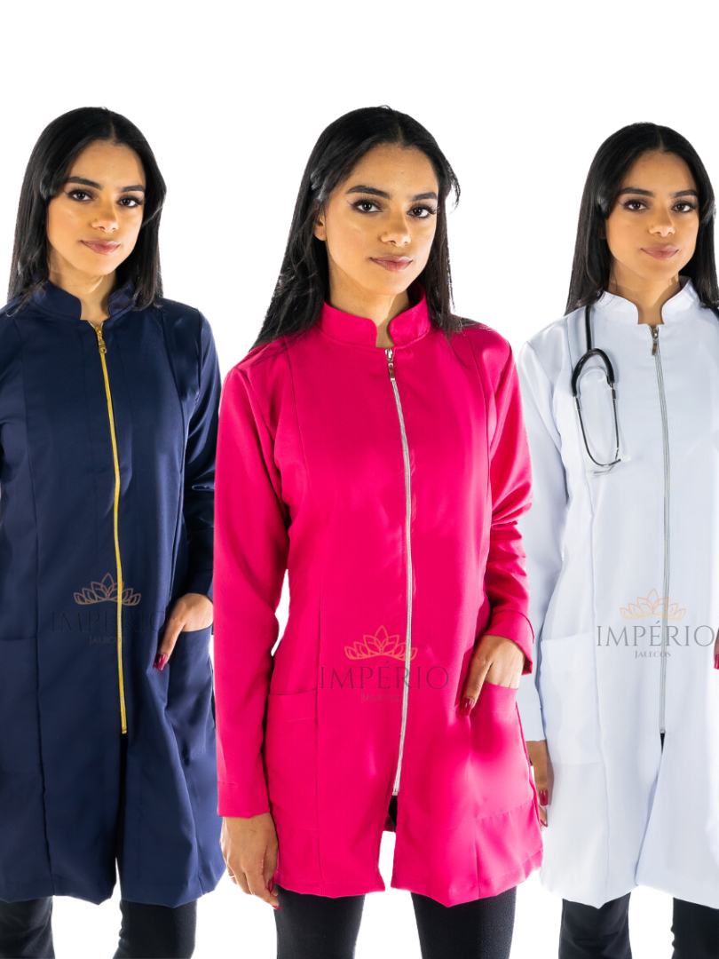 Jaleco Feminino Acinturado Oxford Manga longa Várias Cores Acinturado Com Zíper Gola Padre