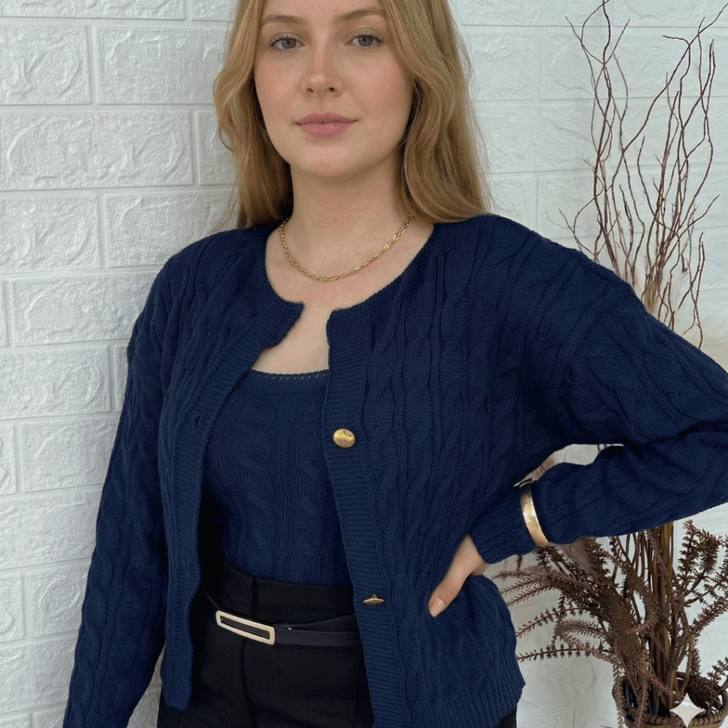 Conjunto Casaco Feminino de Tricô Cardigan com Botões e Tranças + Regata Tricot Twin set de Frio