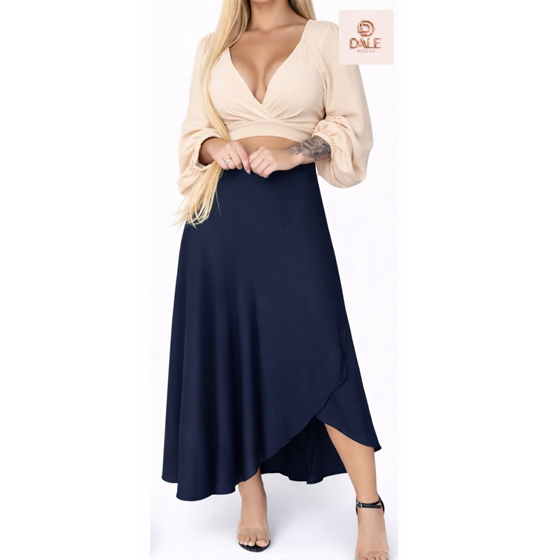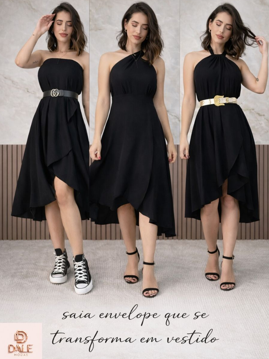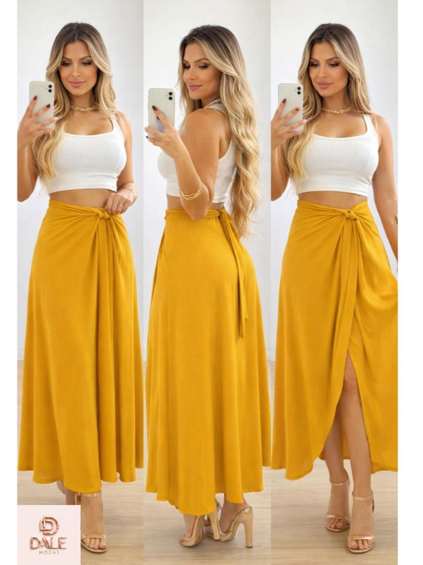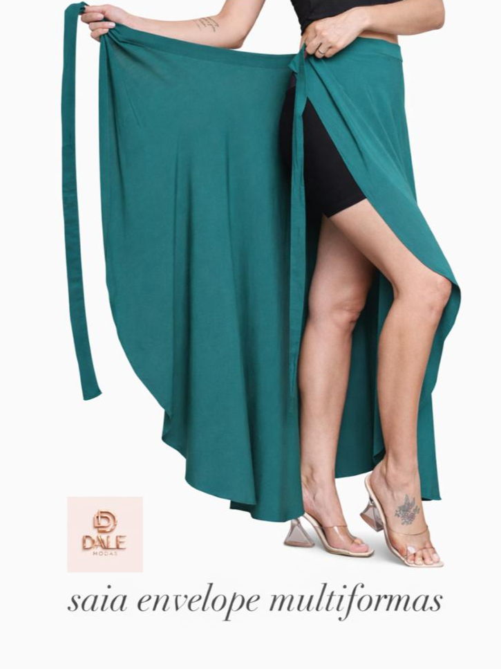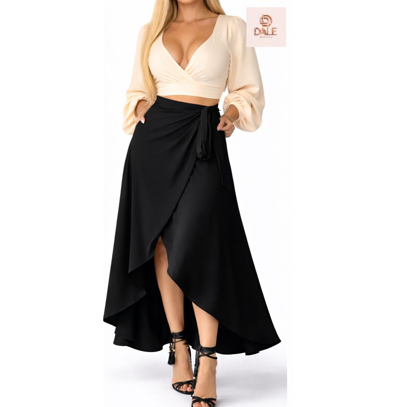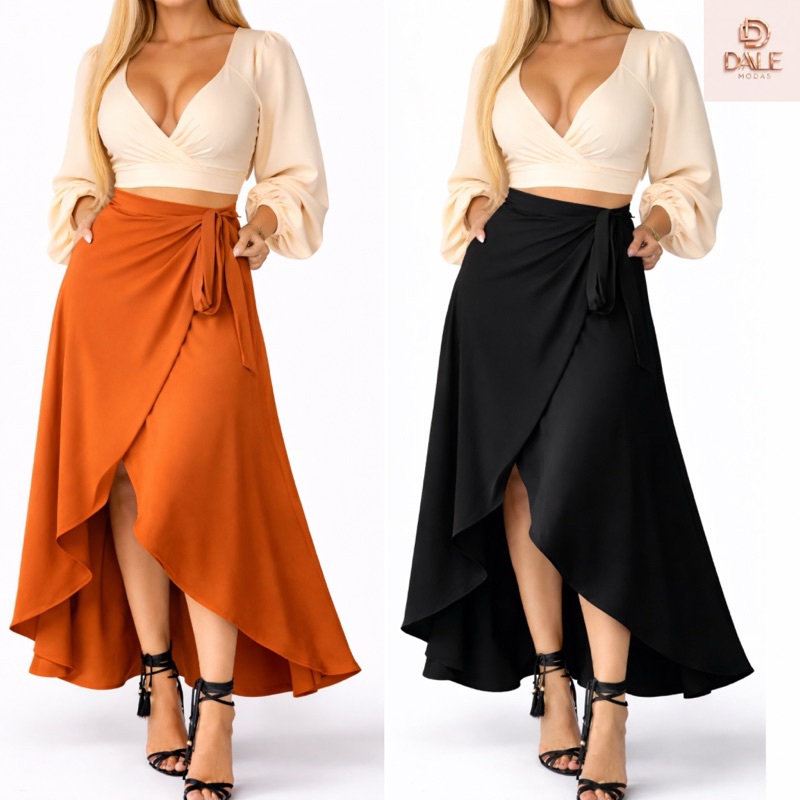 Saia Envelope Feminina Mídi Transpassada Multiformas de Amarrar Cintura Alta preta