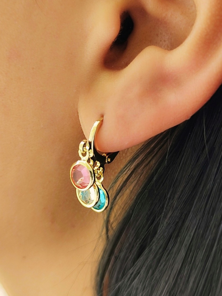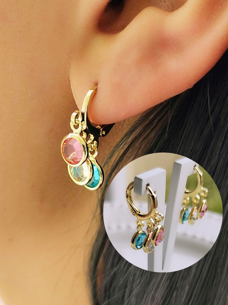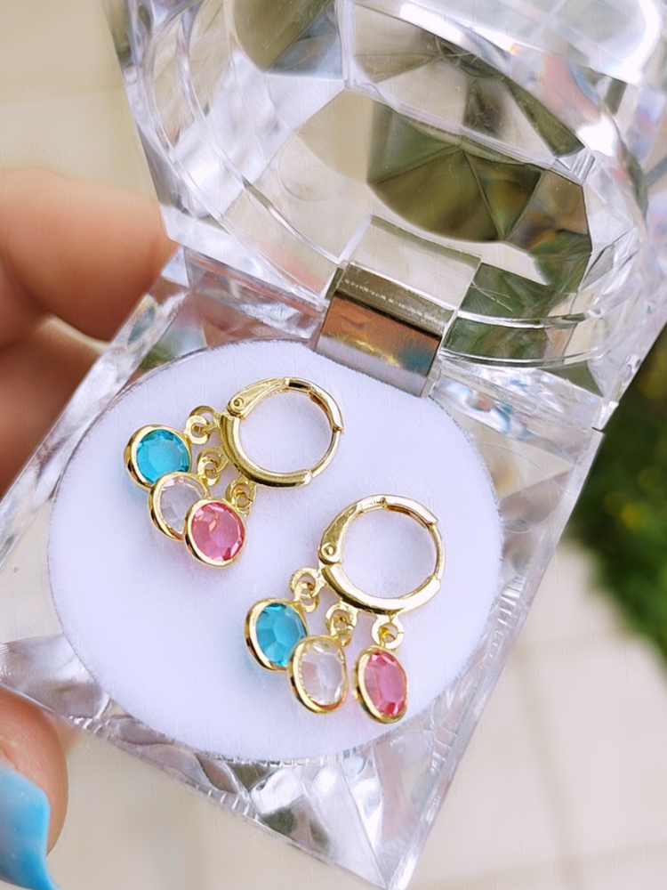 Brinco de Argolinha com Pingente Pendurado 3 Zircônia Coloridas Folheado A Ouro 18k
