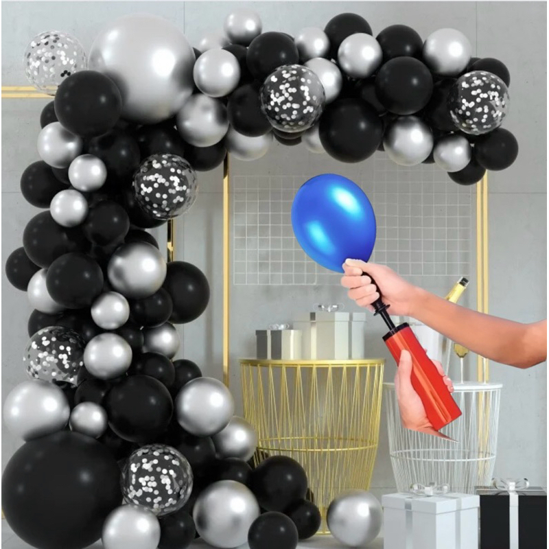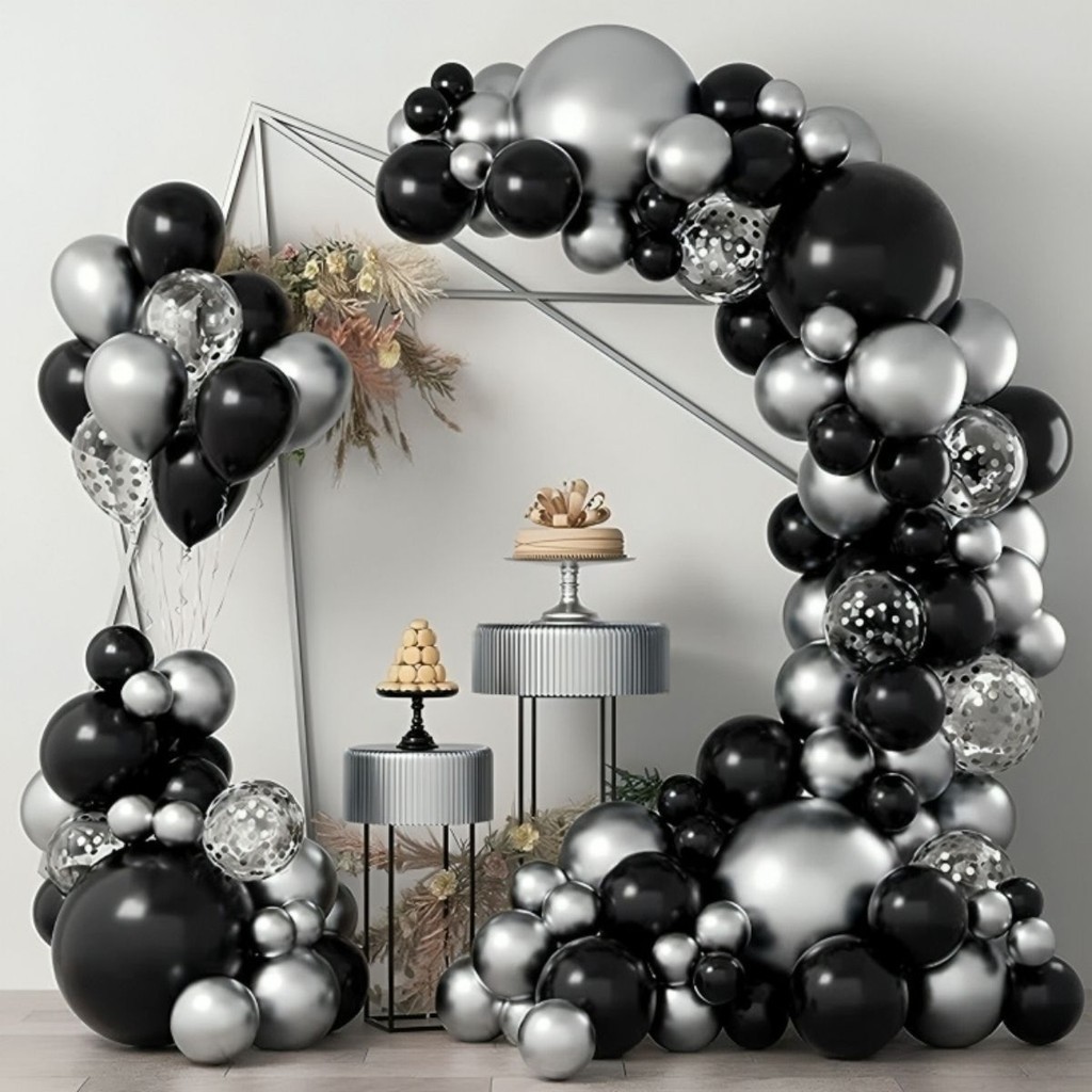 Kit 120 Balões+Bomba Metalizado Preto Prata+Fita 5 Arco Desconstruido Festa Decoração Aniversario