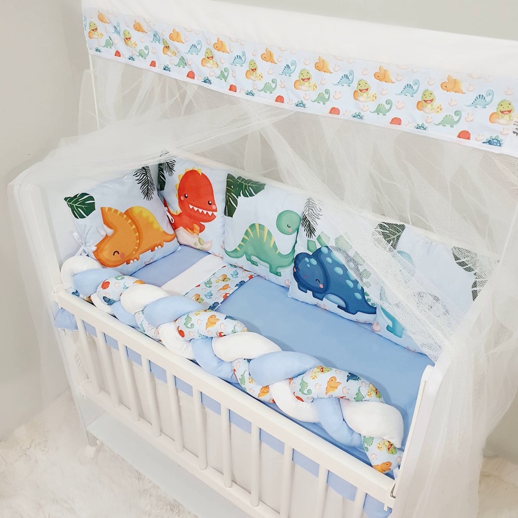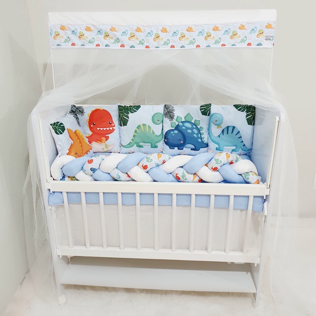 KIT PARA MINI BERÇO 12 PEÇAS COM TRANÇA E ALMOFADINHAS + SAIA DINO