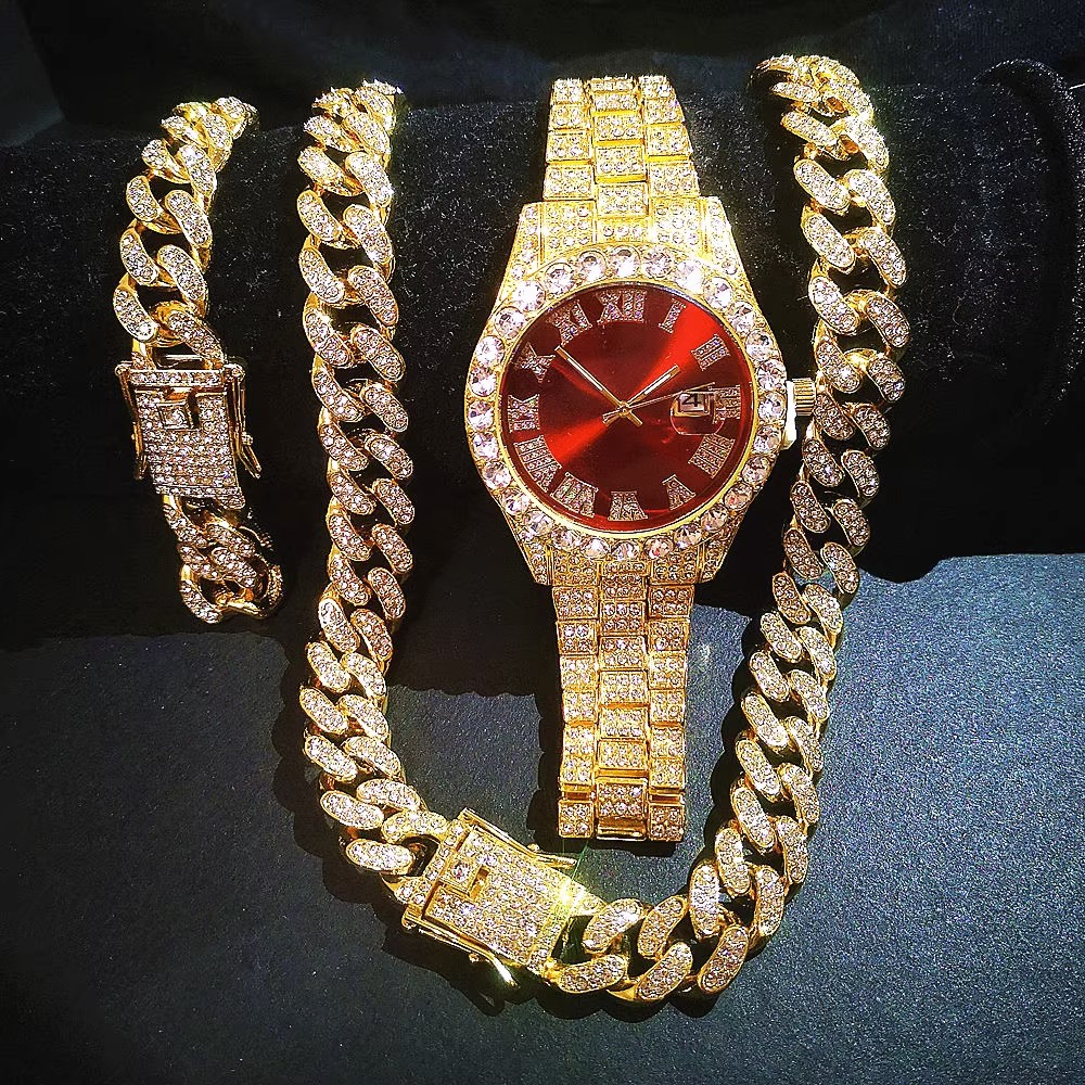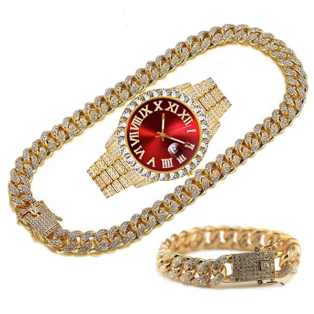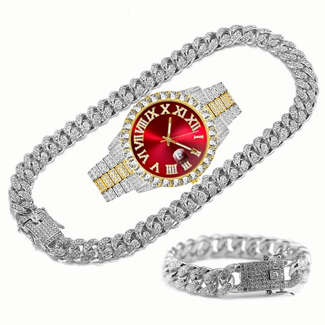Novo RelóGio 3 PeçAs Colar De Prata Hip Hop Kit Pulseira Cubana Corrente Masculina Bling JóIas Diamante Correntes