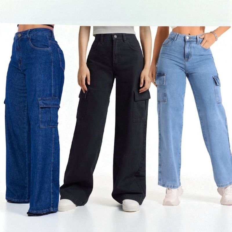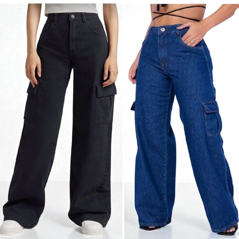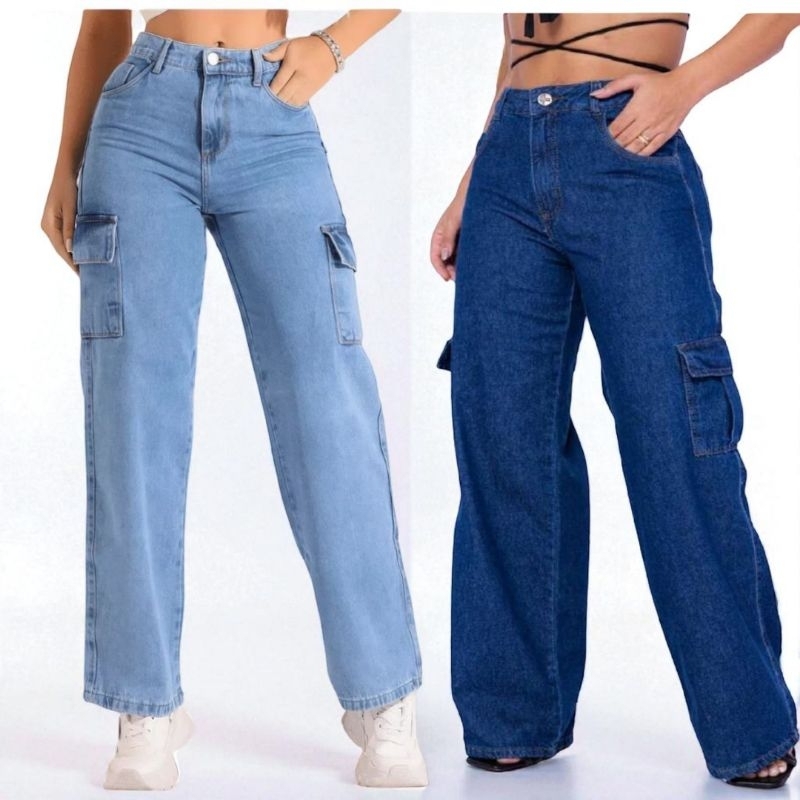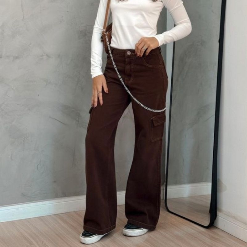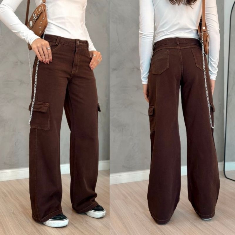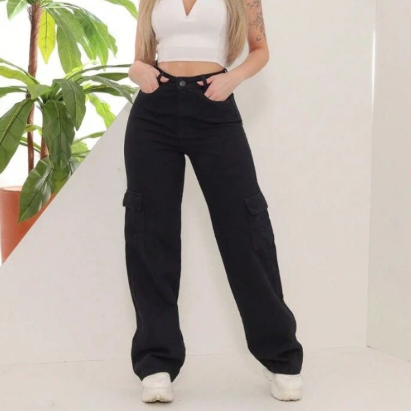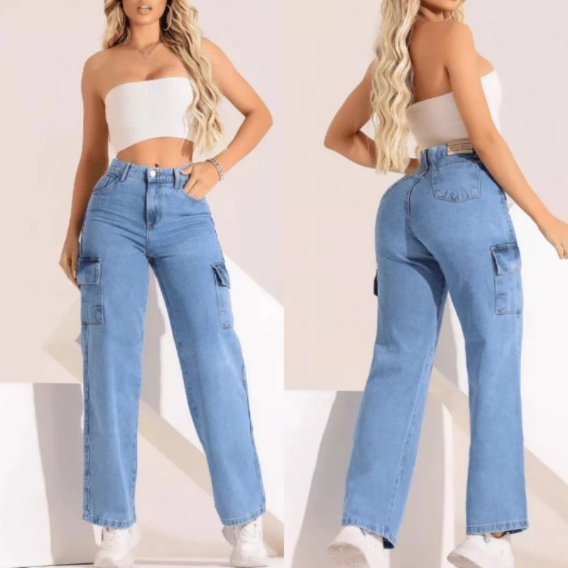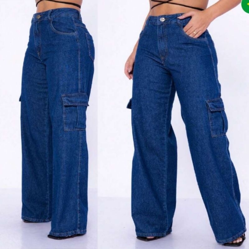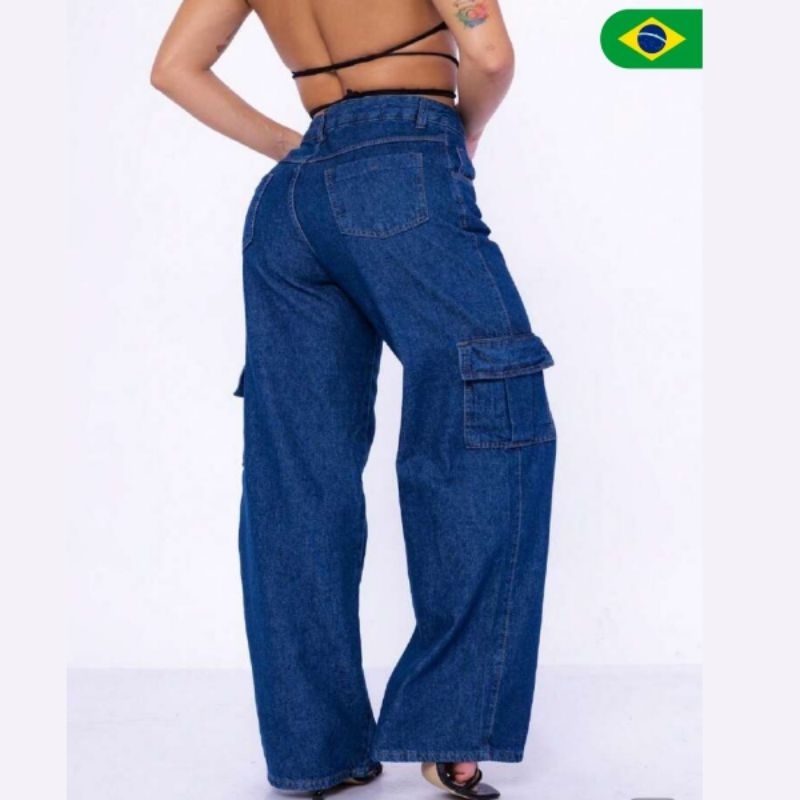 Calça Cargo Jeans 100 Algodão Feminina cintura alta