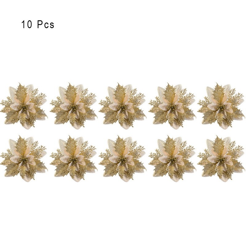 10pcs 14cm Flores De Natal Glitter Ouro Vermelho Brilhante Cabeça De Flor Ornamento Decorações Para Casa Navidad Presente De Ano Novo-MZ