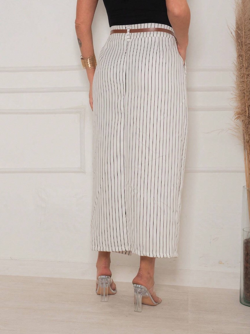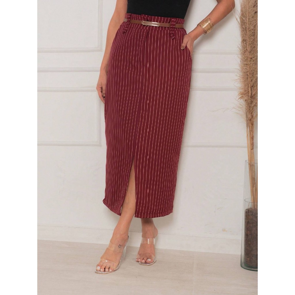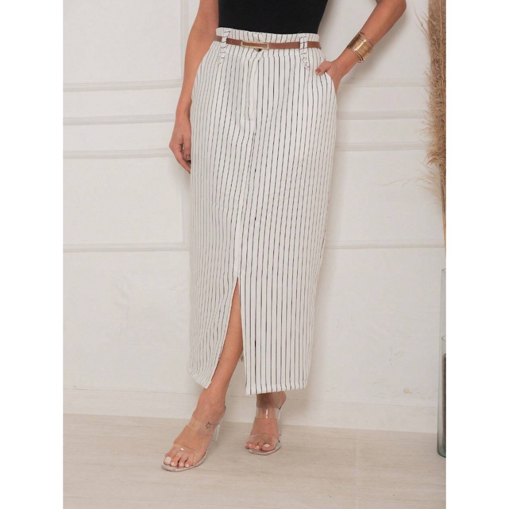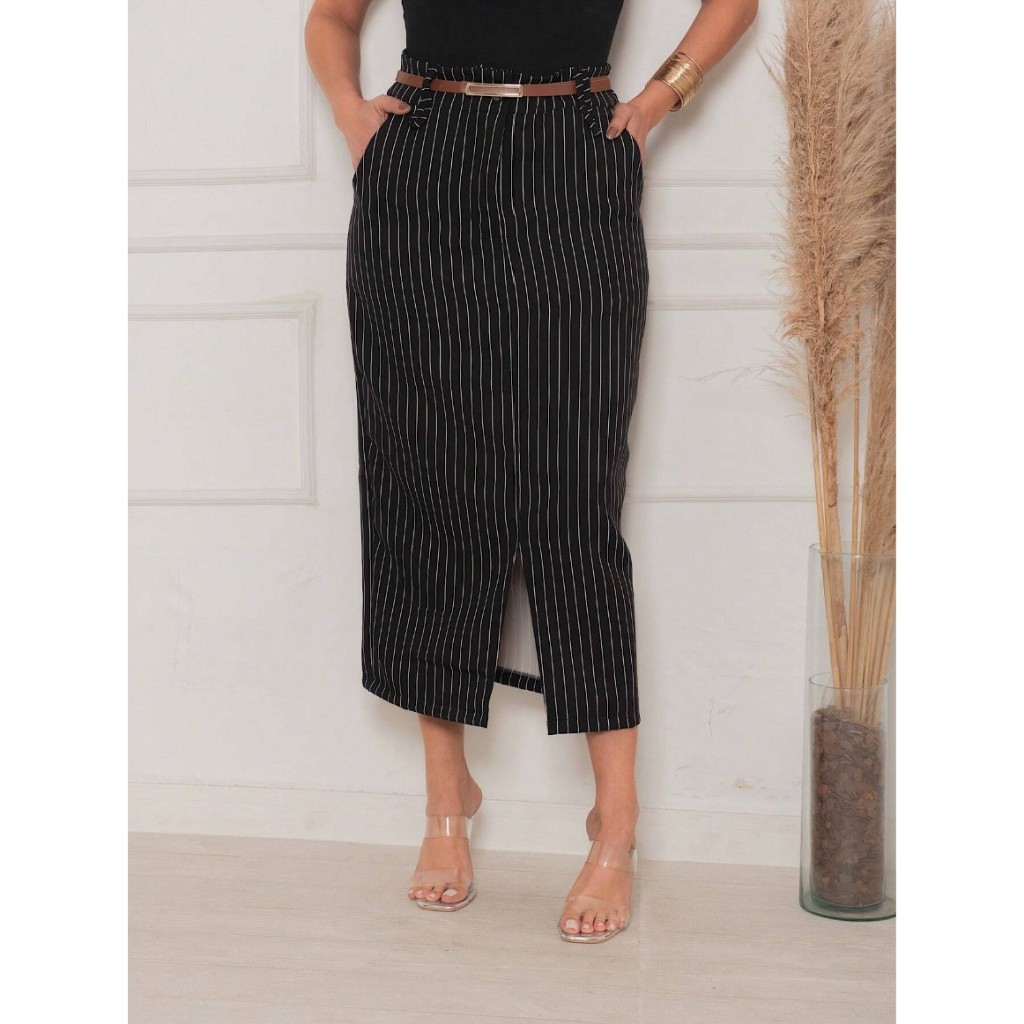 Saia Midi Longa Feminina Alfaiataria Listrada Risca de Giz Cintura Alta Moda Evangelica Elegante