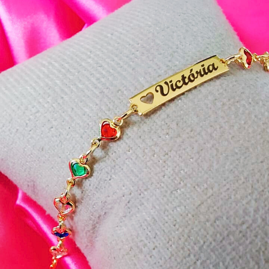 Pulseira infantil Menina Chapa Coração Colorido Banhado a Ouro 18k
