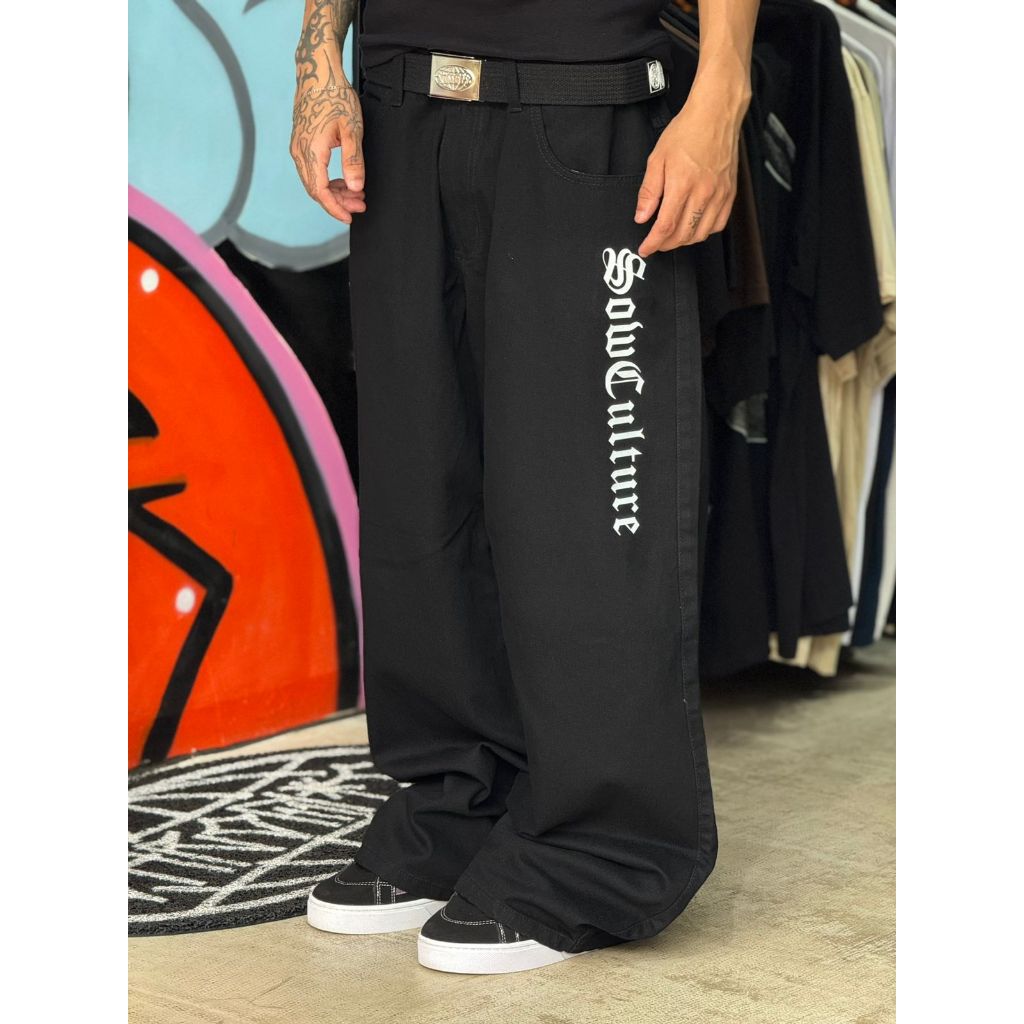 Calça Baggy Jeans larga Preta Escrita Balão Hip Hop Street Skate novidade lançamento promoção