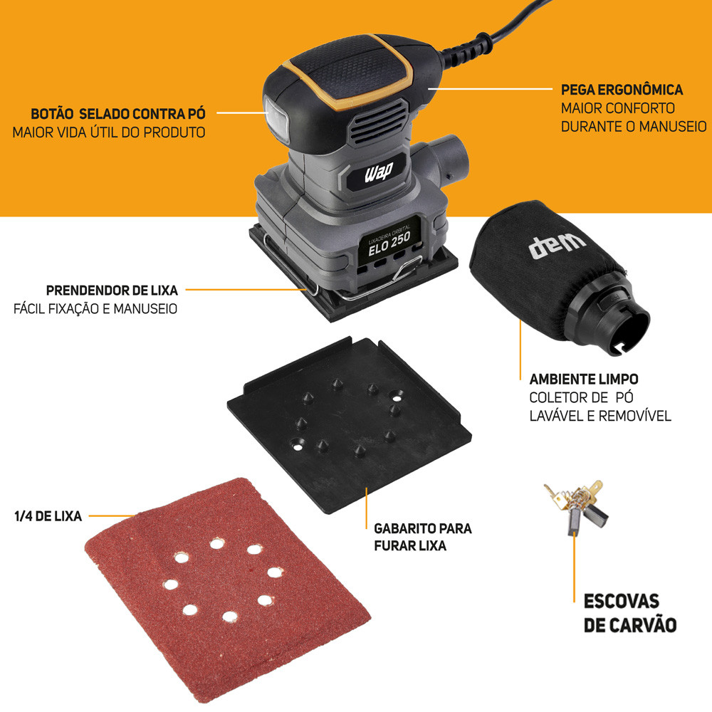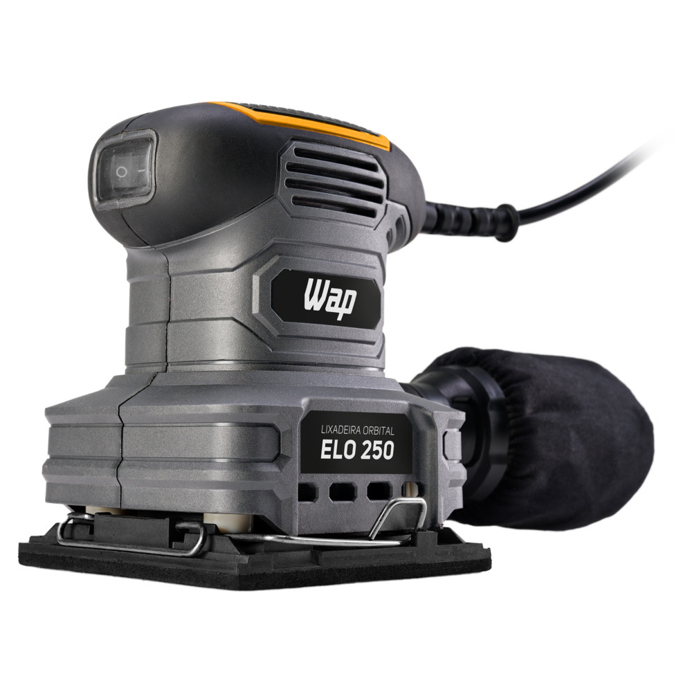 Lixadeira Elétrica de Mão Profissional 250W Orbital Cinza 14000 OPM WAP ELO 250 Coletor 240ml