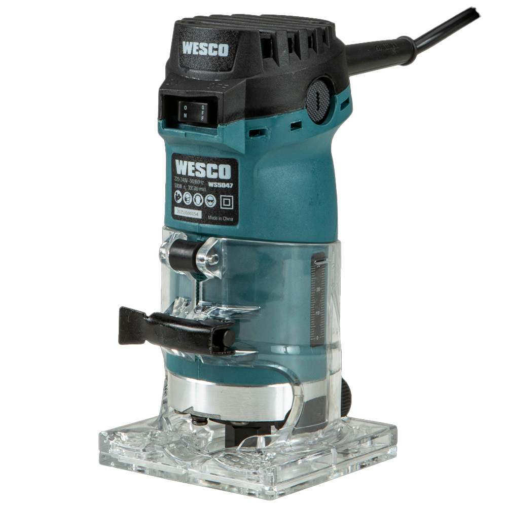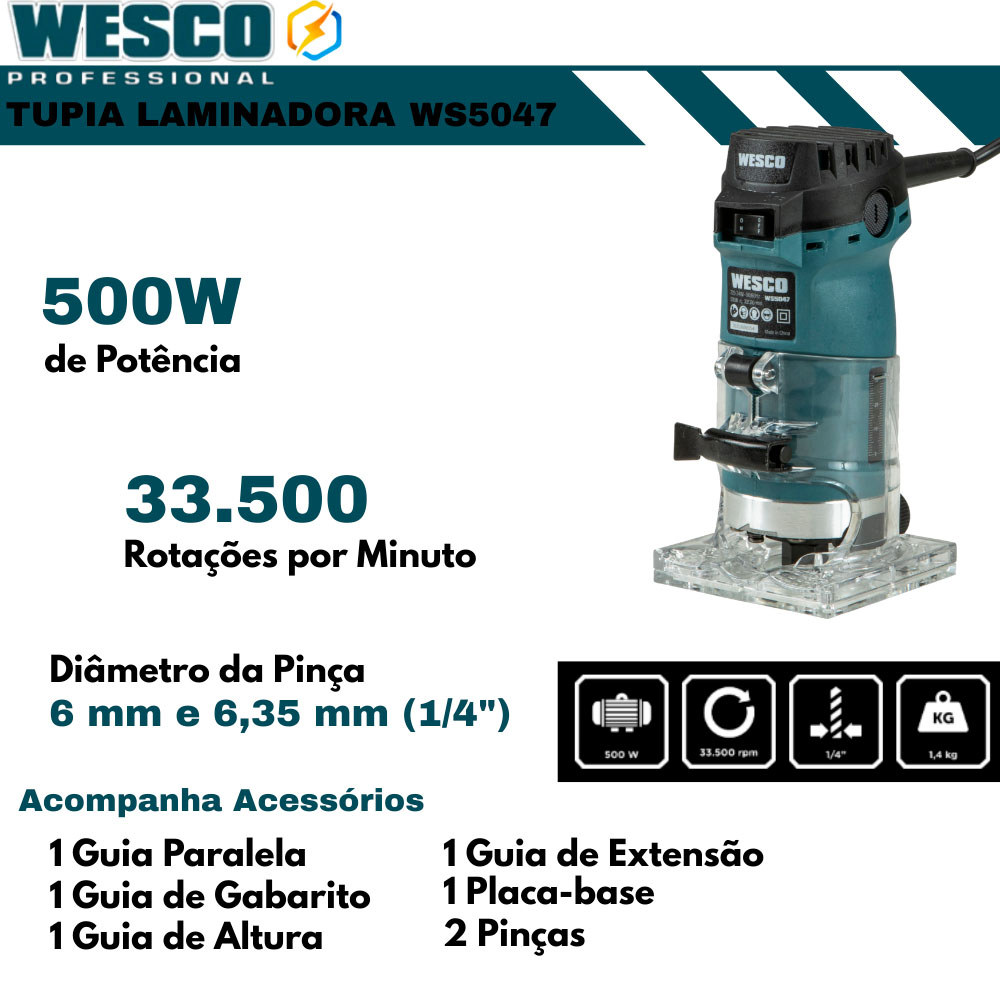 Tupia Laminadora Wesco 500W 33.500 RPM Guias Paralela Gabarito Altura Extensão e Placa-Base