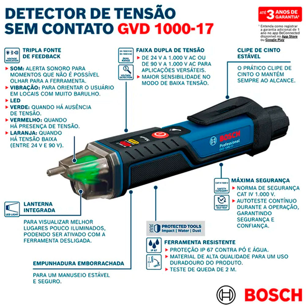 Detector de Tensão sem Contato Profissional Bosch Indicador LED com 2 Pilhas 2 Faixas de Tensão