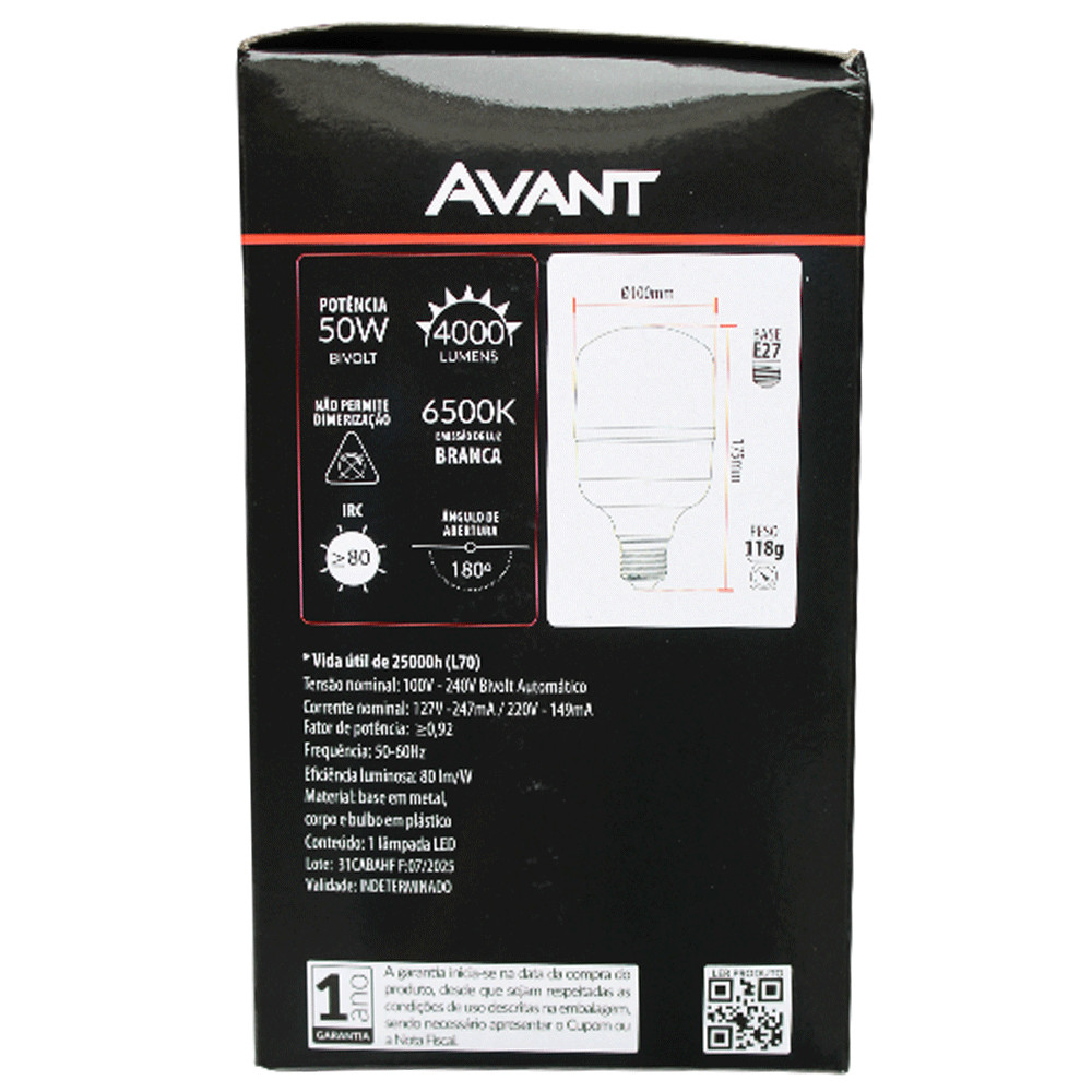 Kit 6 Lâmpadas LED Avant 50W High Power 4000lm Luz Branca 6500K Bivolt Base E27 Alta Iluminação