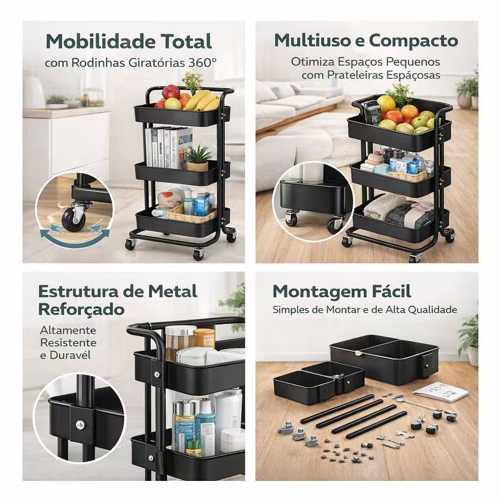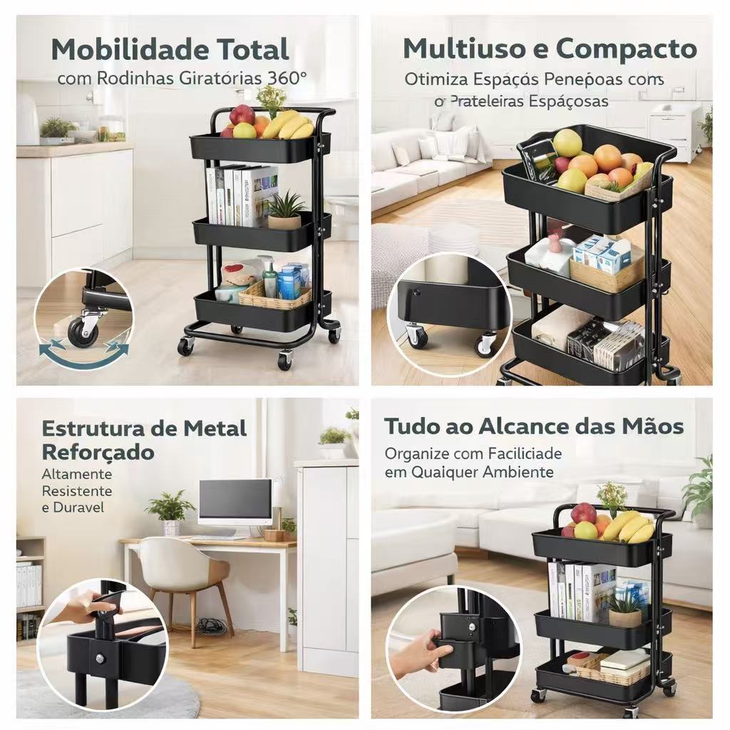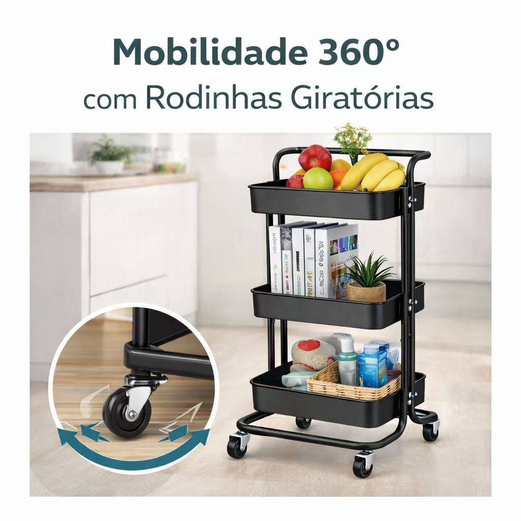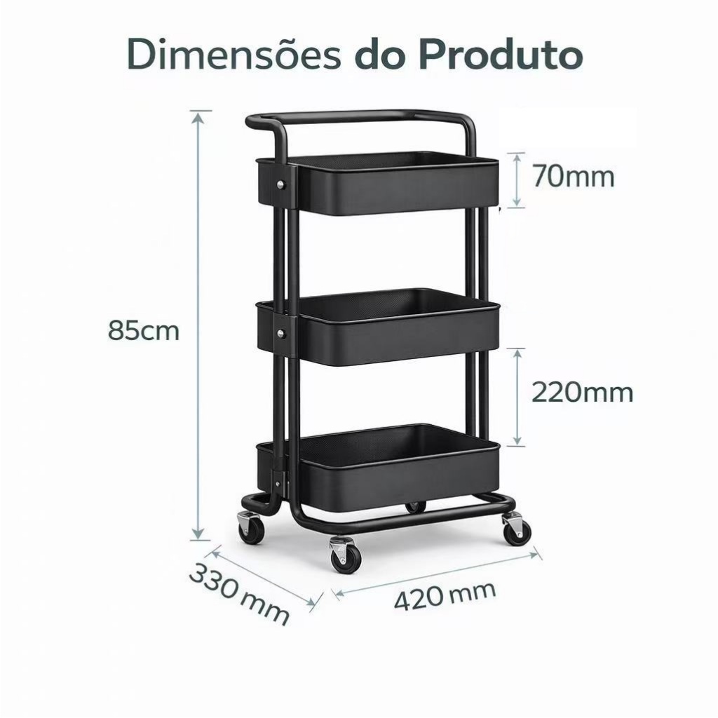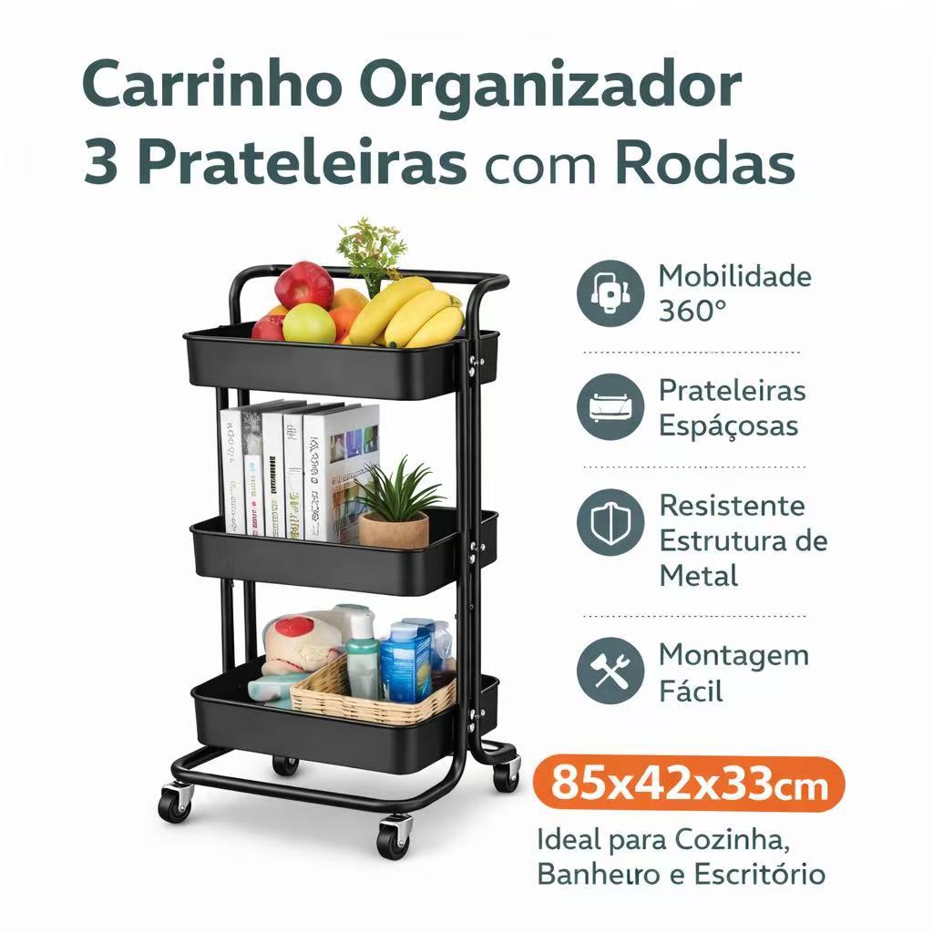 Carrinho Organizador 3 Prateleiras com Rodas – Estante Multiuso para Cozinha, Banheiro e Escritório (85x42x33cm)