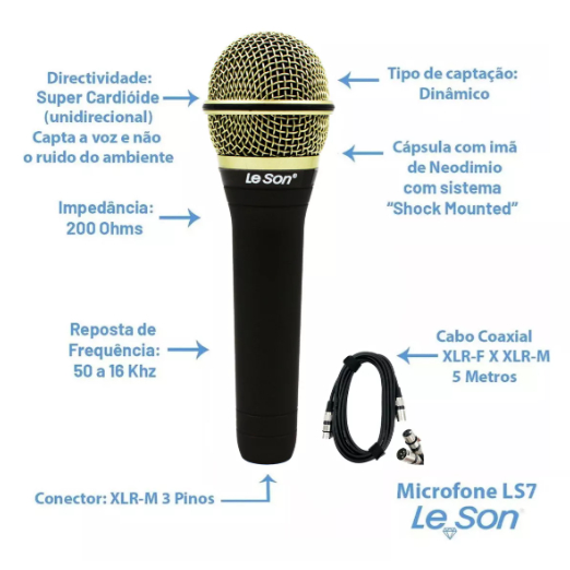 Microfone Dinâmico Le Son Ls7 Profissional Com Cabo/5m Sm58 Cor Preto/Grafite