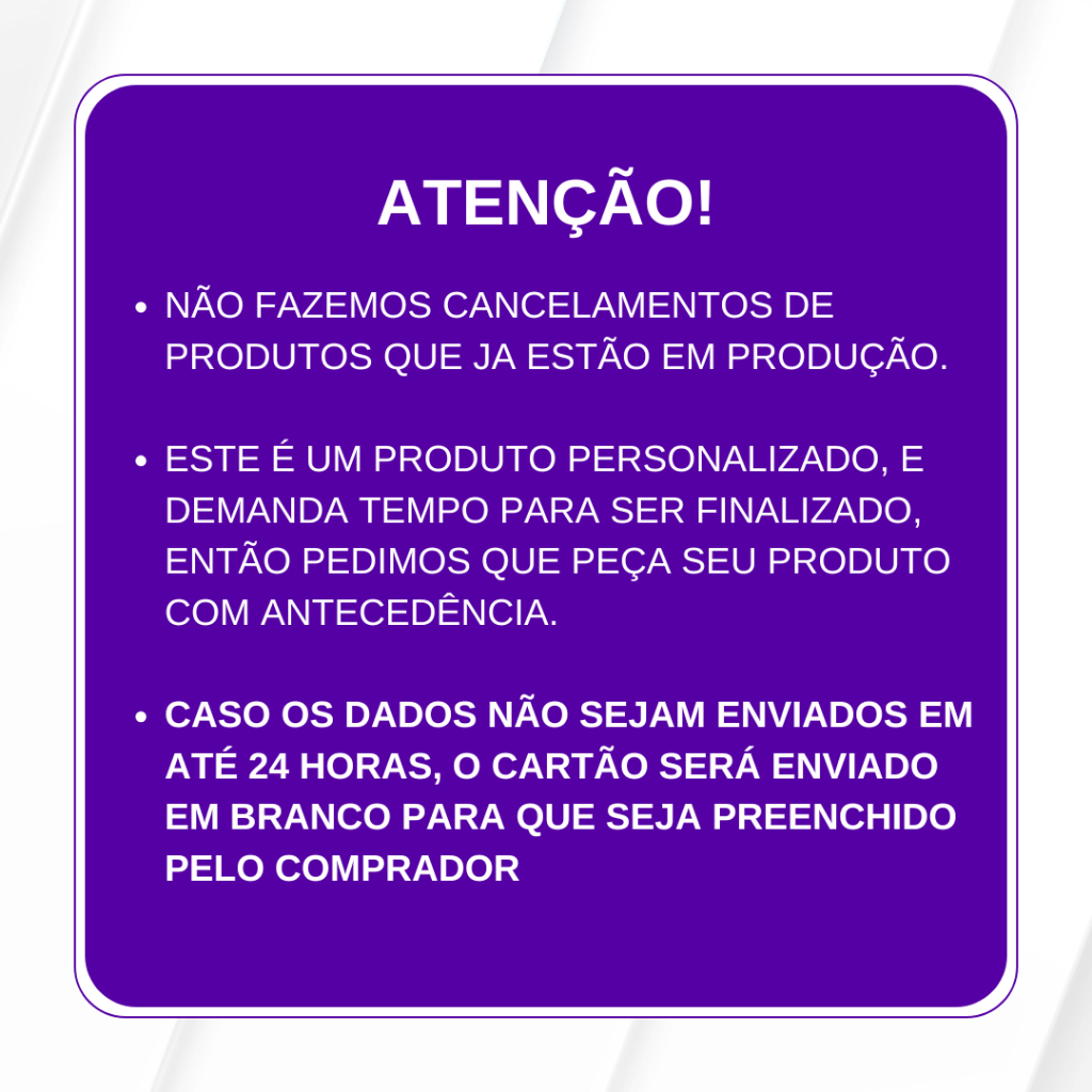 Sob encomenda: envio após 7 dias da compra