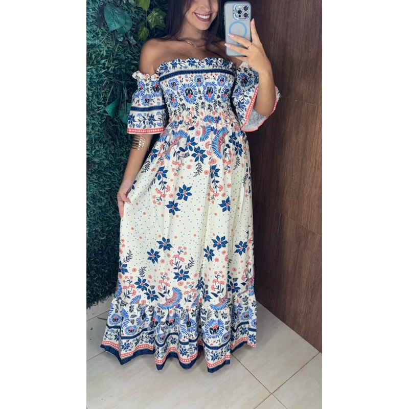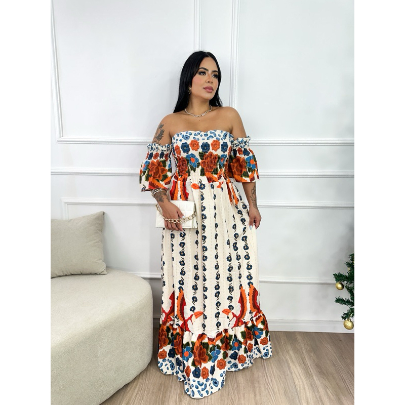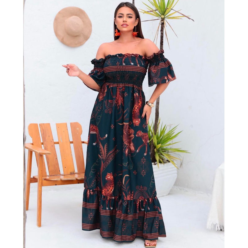 Vestido Longo elastec inspiração em estampas tropicais