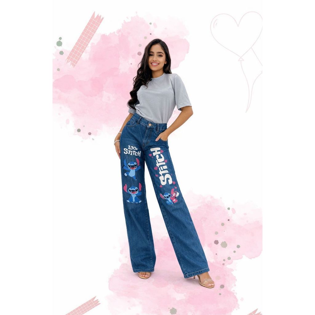 Calça Jeans Wide Leg Stitch Juvenil Premium Feminina Moda Kids Estilo Gringa Calça para Meninas