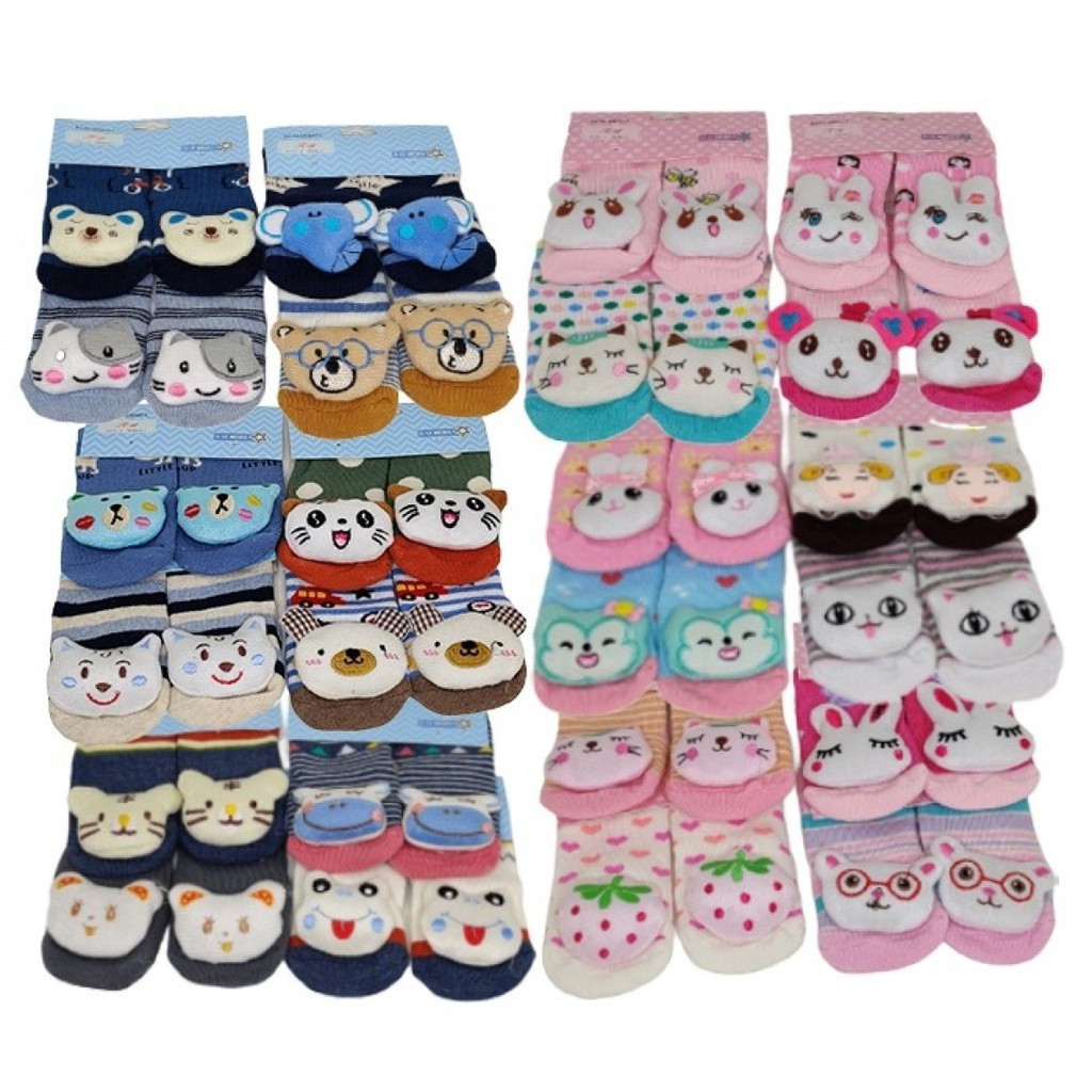 Kit 1-6 Pares Meia Infantil 3D com Chocalho de Bichinho Fofinha Bebê 0 a 24 meses - Menino e Menina