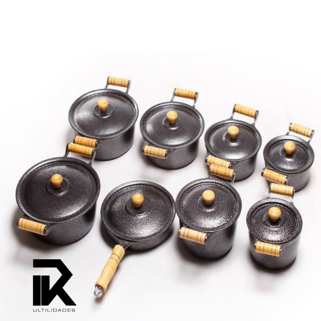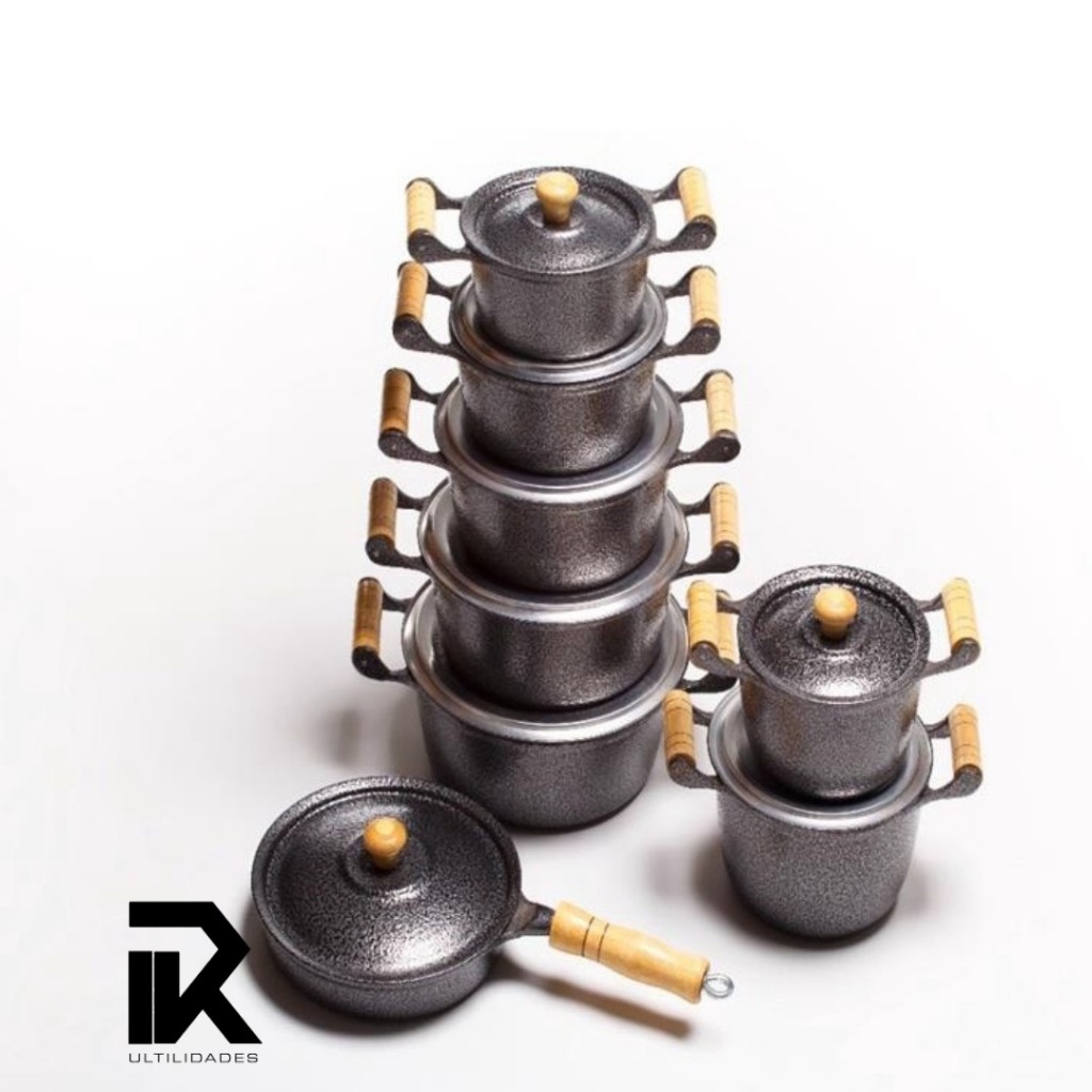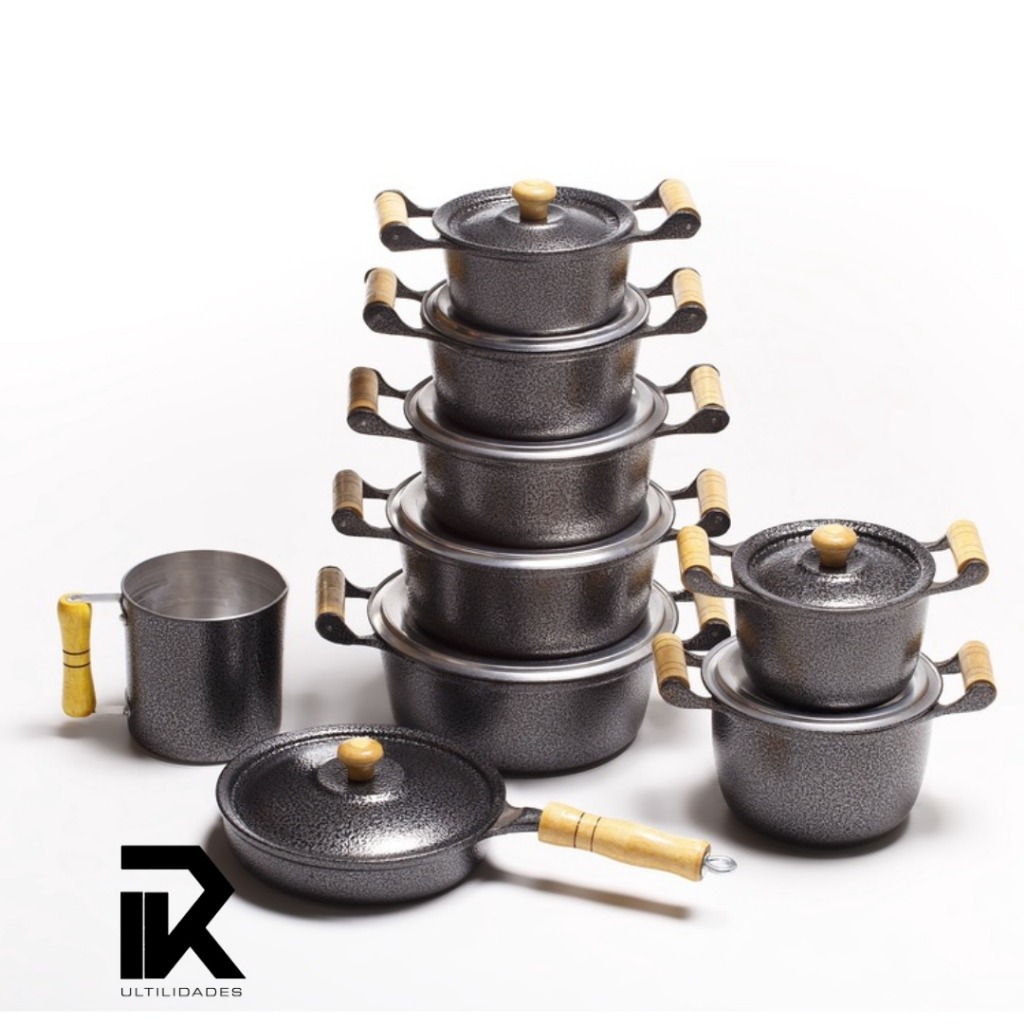 Conjunto 5 Panelas Aluminio Craqueado Preta Batido Frigideira e Caldeiroes 9 Peças