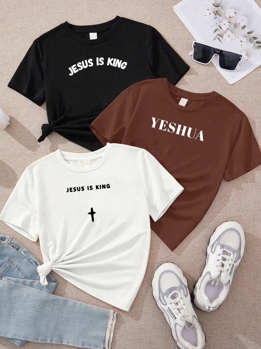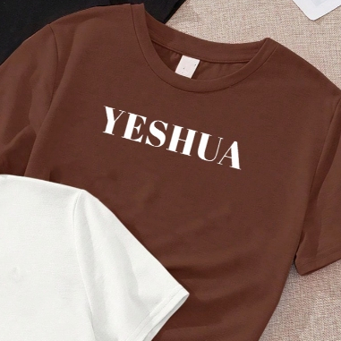 Kit com 3 blusas Cristãs Jesus is king Yeshua feminina branca e rosa marrom Off white 100% algodão