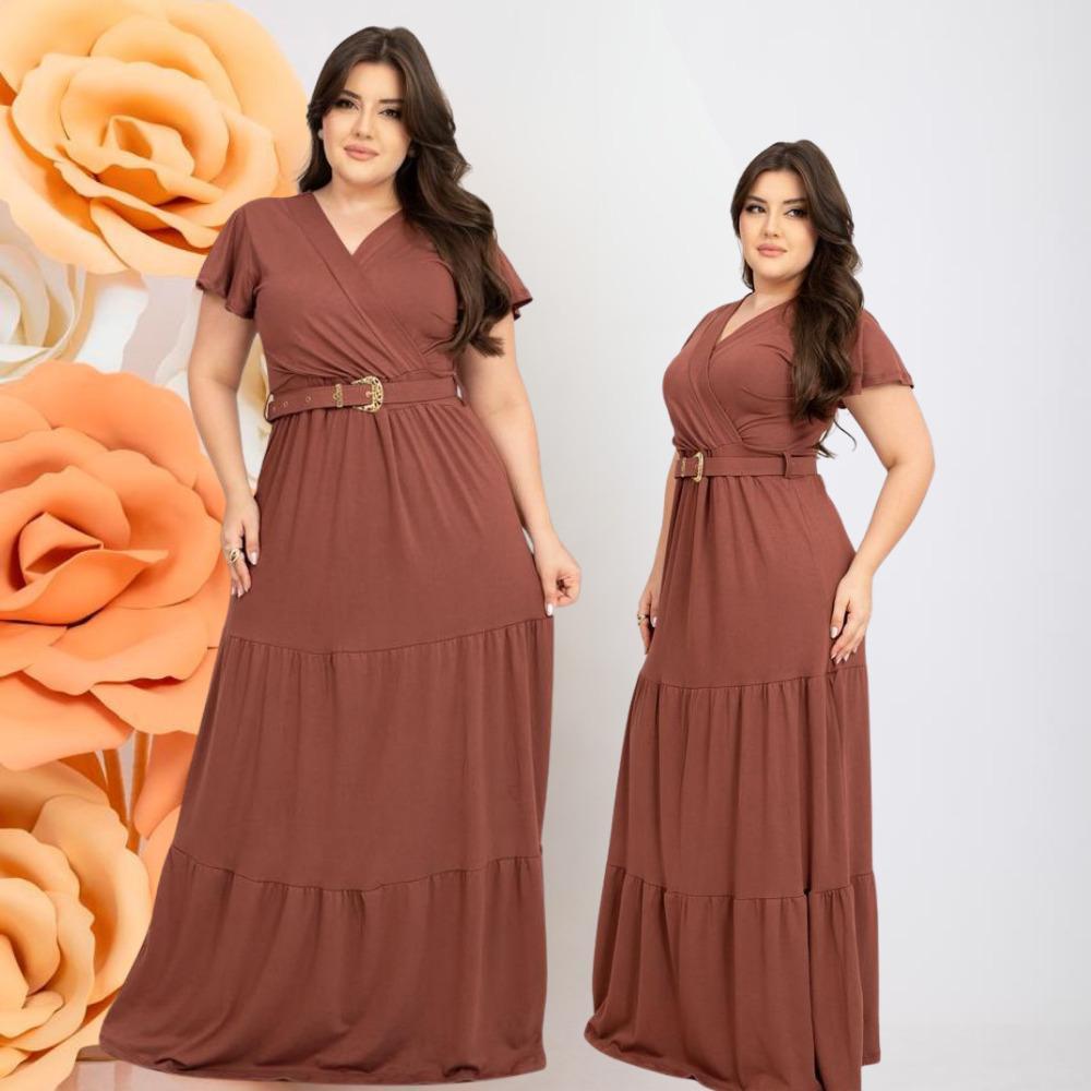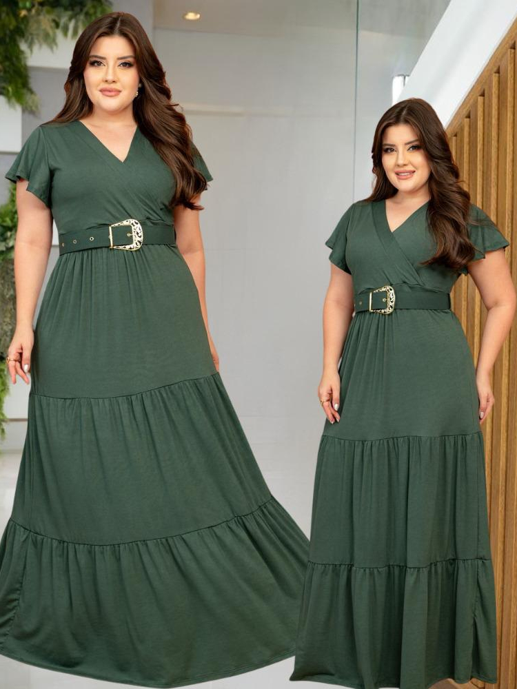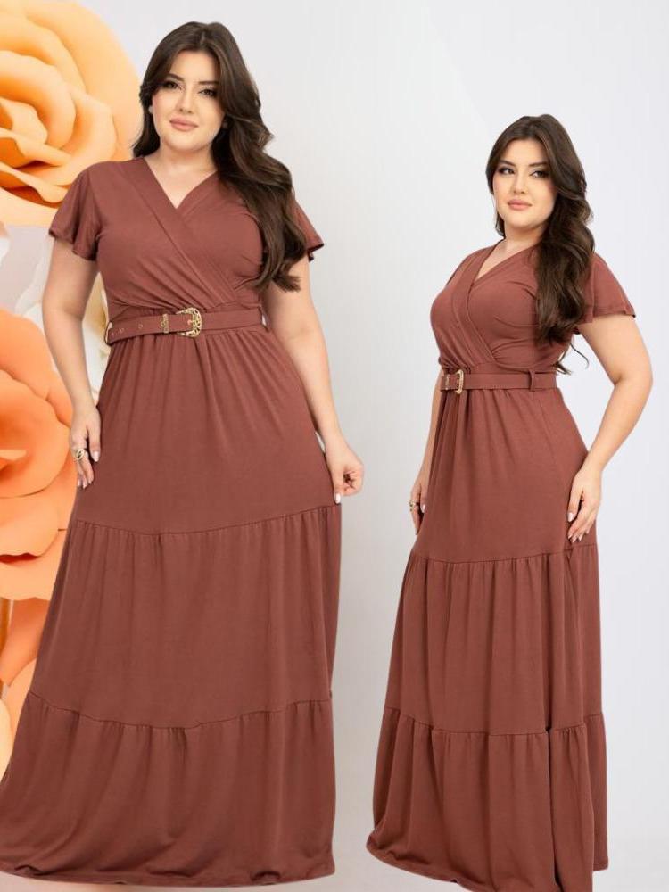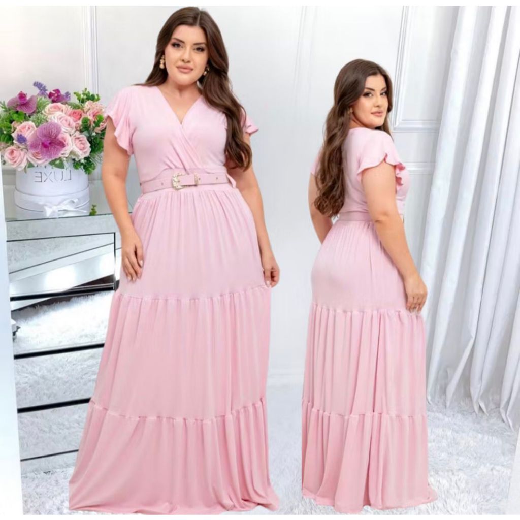 Vestido Longo Feminino Casual Manga Curta Moda Evangelica Com Cinto Plus Size Para Congresso