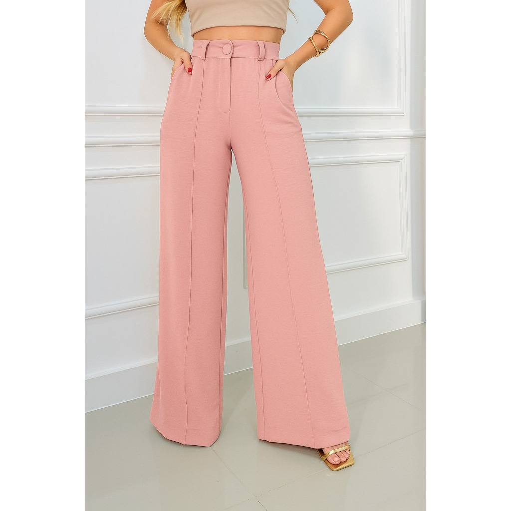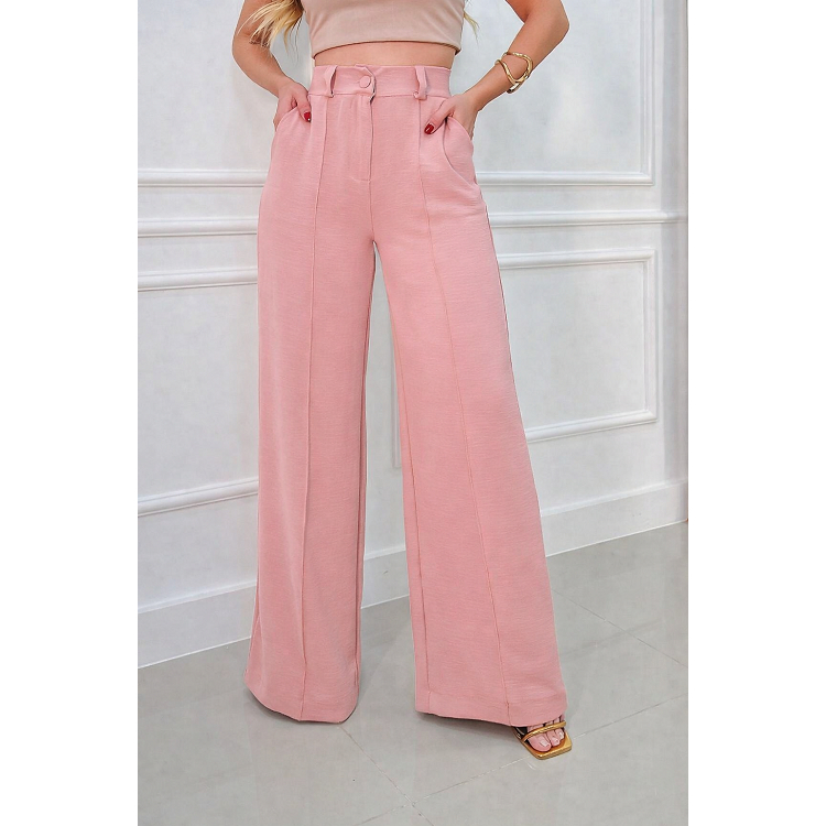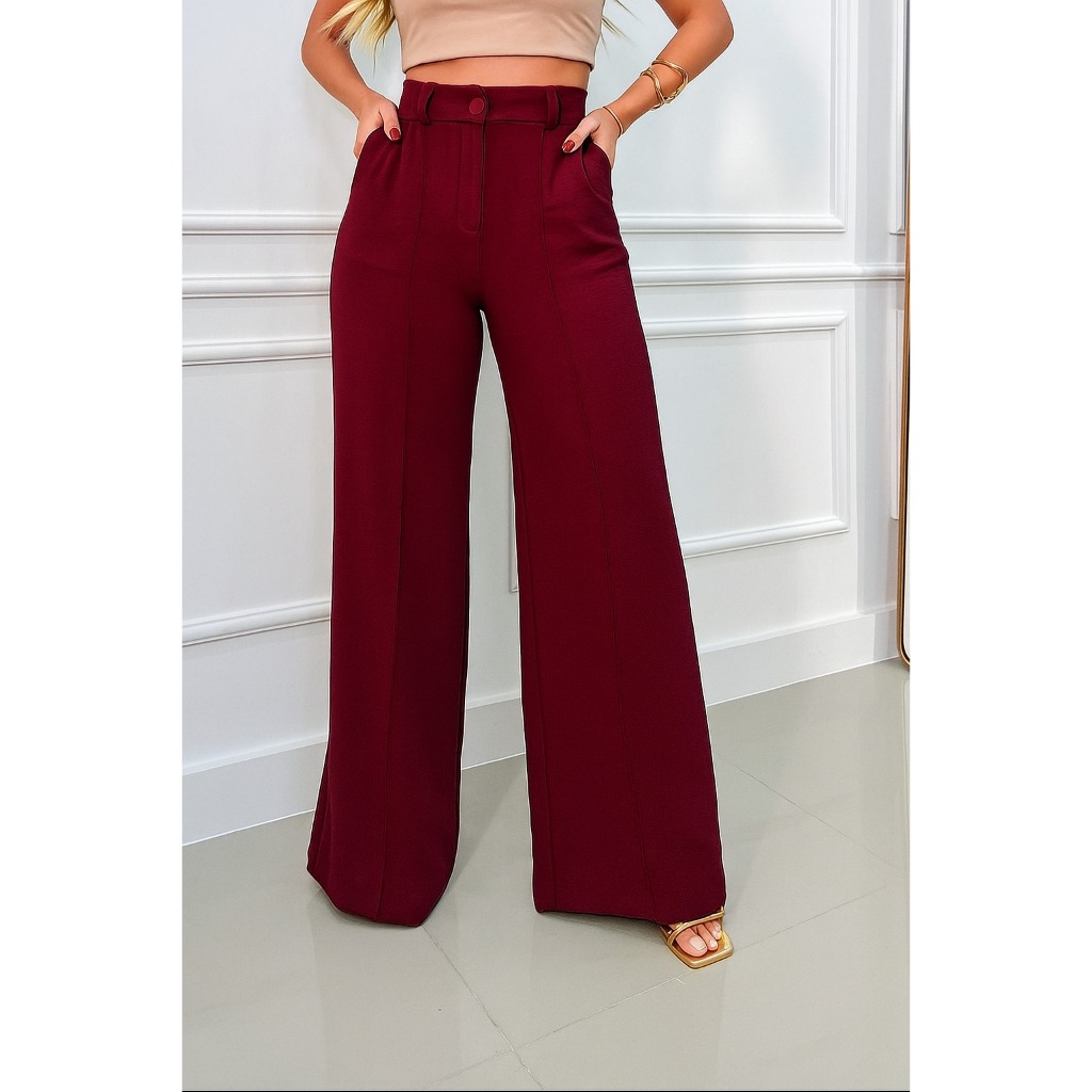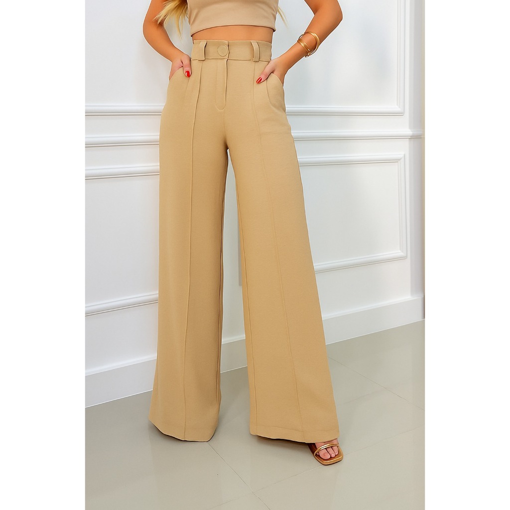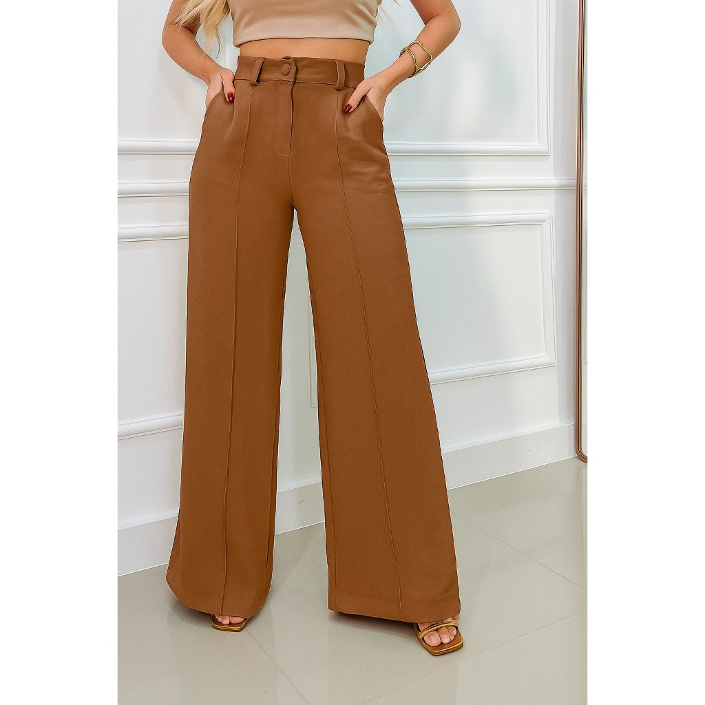 Calça Pantalona Feminina Cintura Alta com Bolso e Zíper Tecido Duna | Tendência 2026