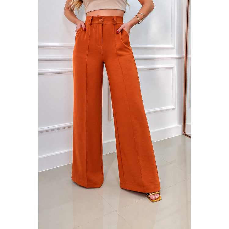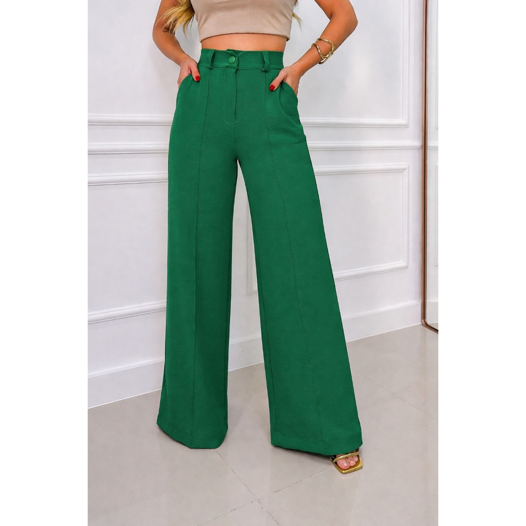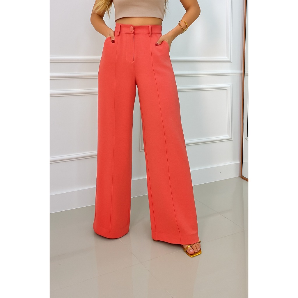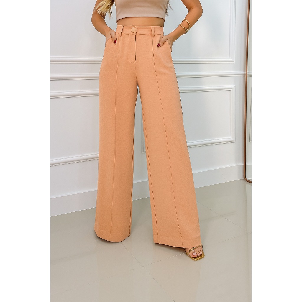 Calça Pantalona Feminina Cintura Alta com Bolso e Zíper Tecido Duna | Tendência 2026