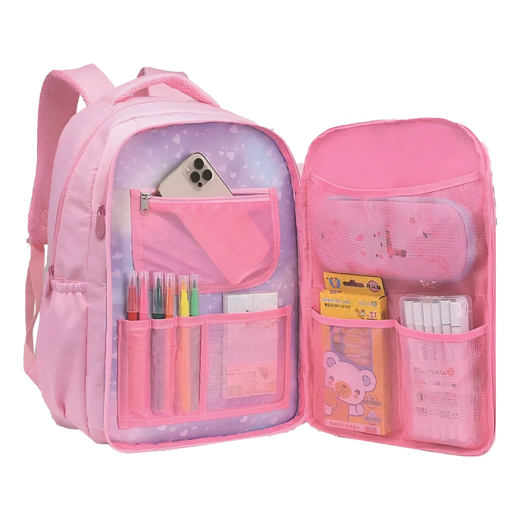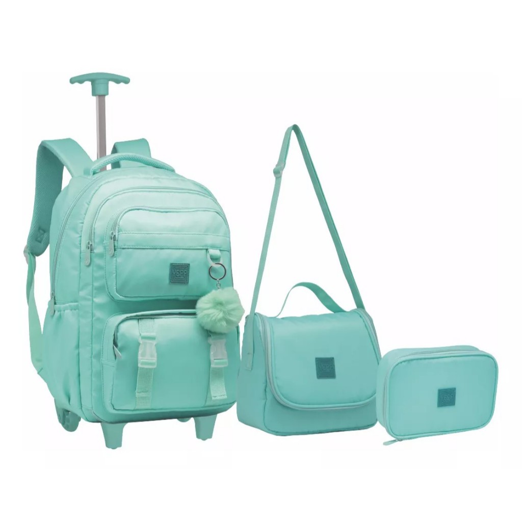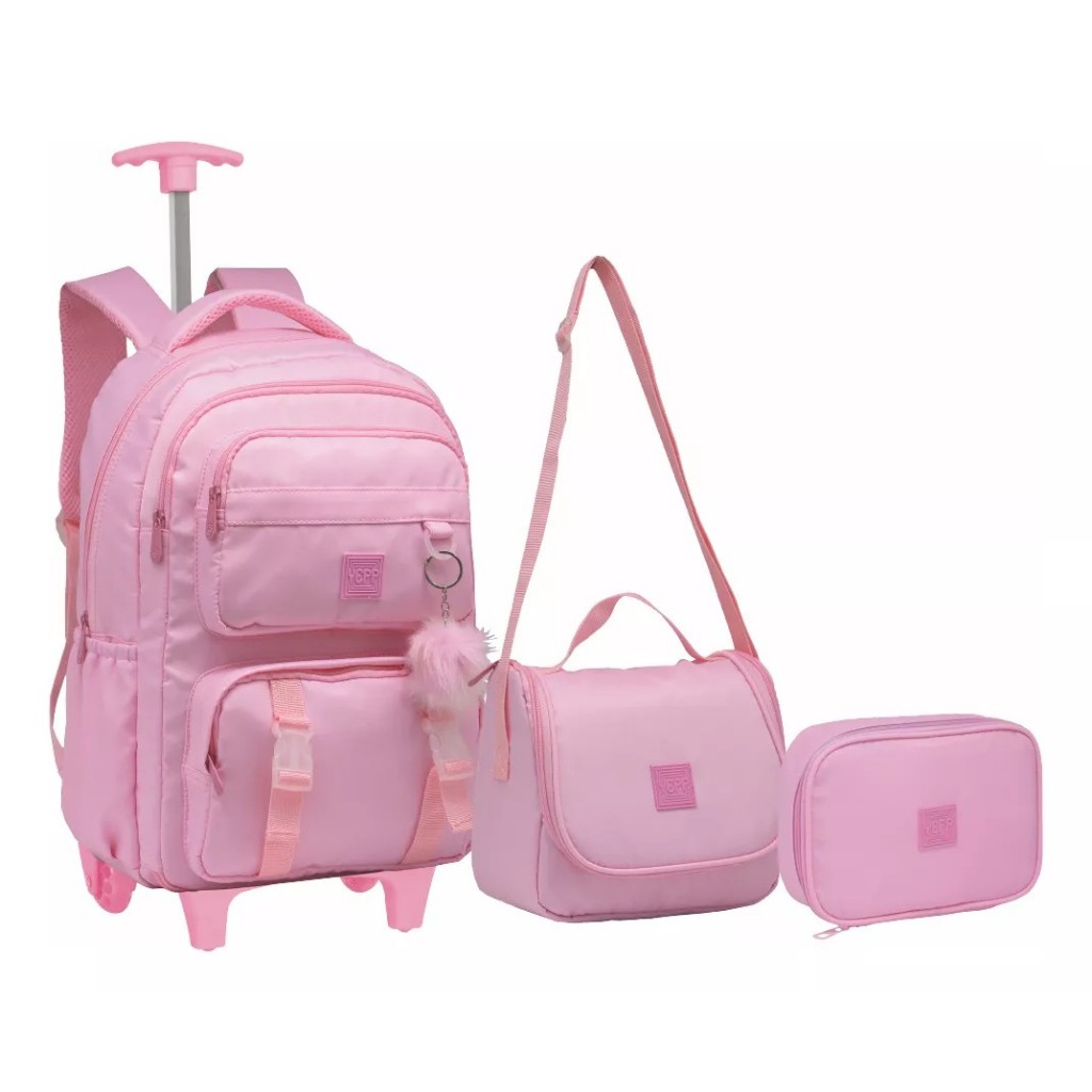 Kit Mochila Feminina De Rodinha Juvenil infantil Escolar Com Chaveiro Urso Abertura 180°