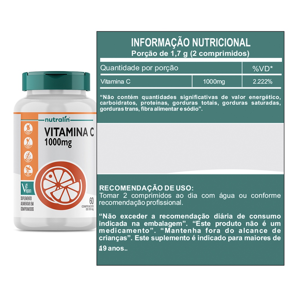 Vitamina C 1000mg Acido Ascórbico 60 Comprimidos Vegano