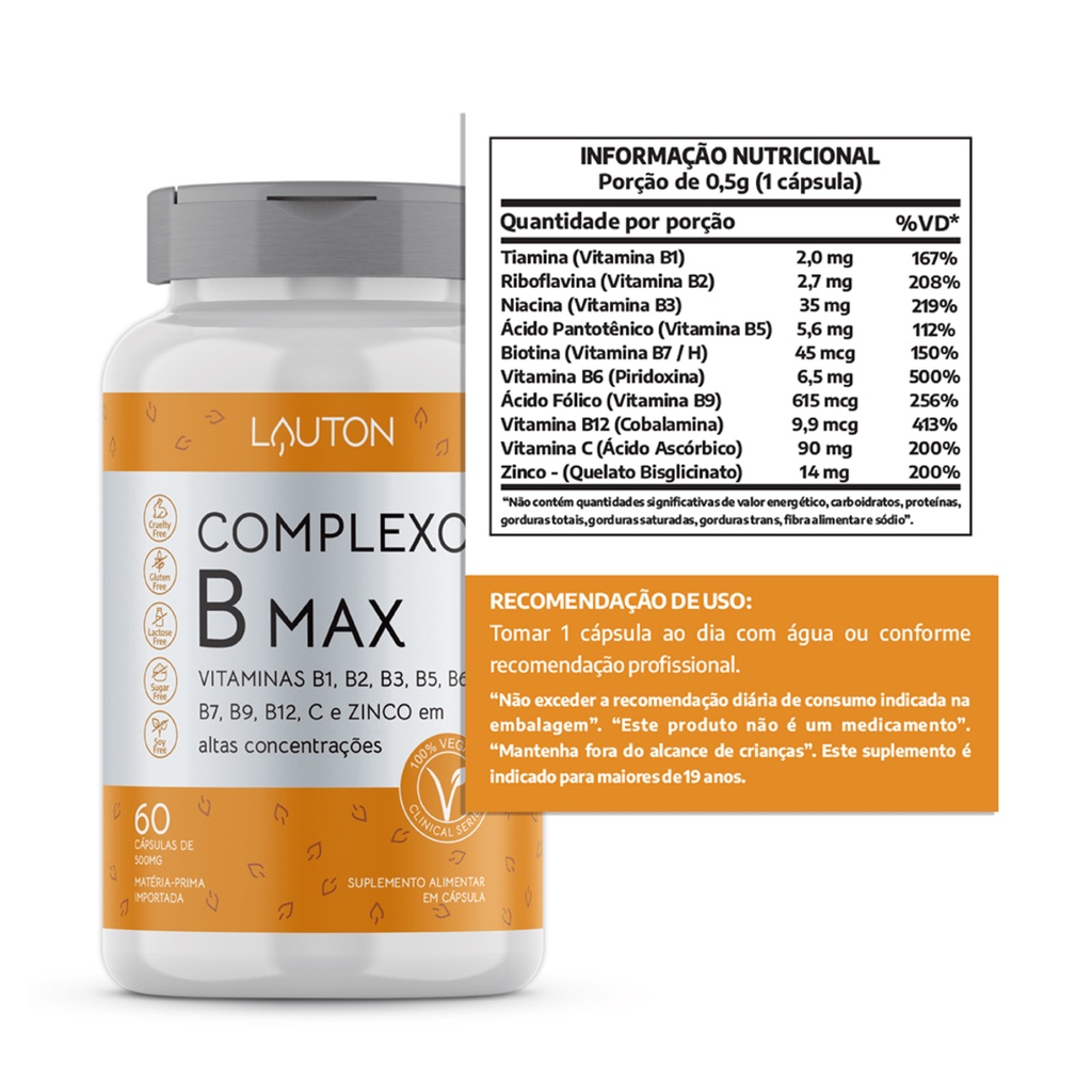 Complexo B Max com Zinco Quelato Lauton Premium - Biotina Ácido Fólico