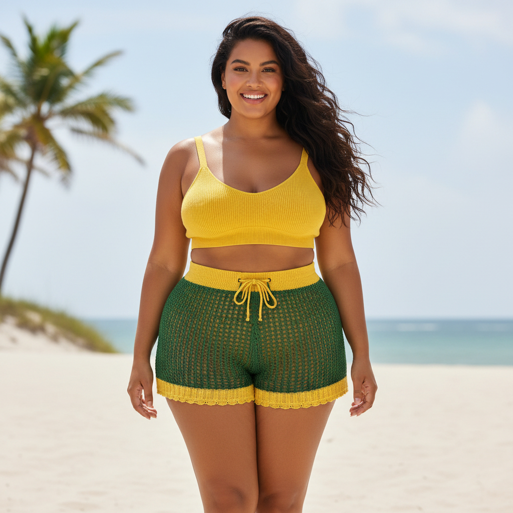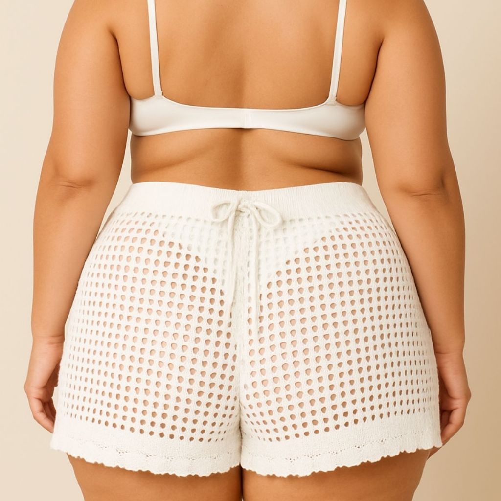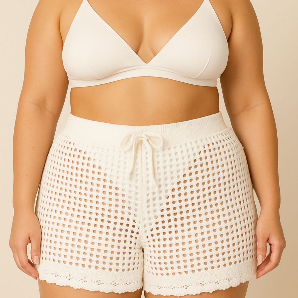 Short Feminino Tricô Crochê Vazado Plus Size Saída de Praia Moderna e Estilosa Envio Imediato