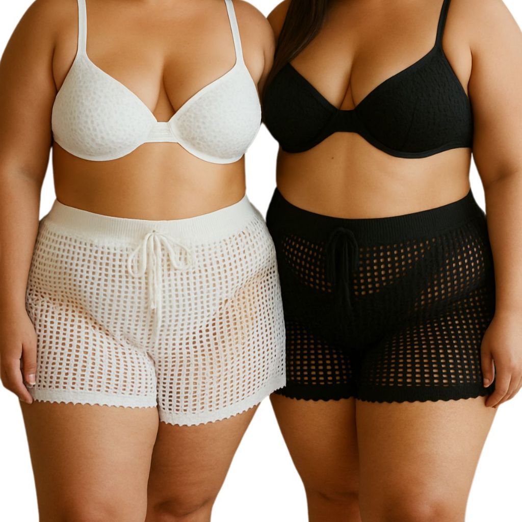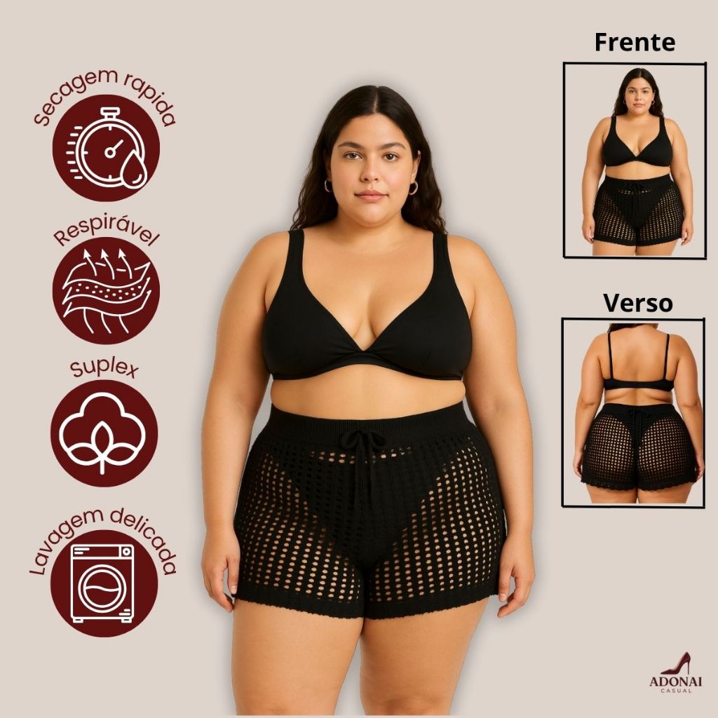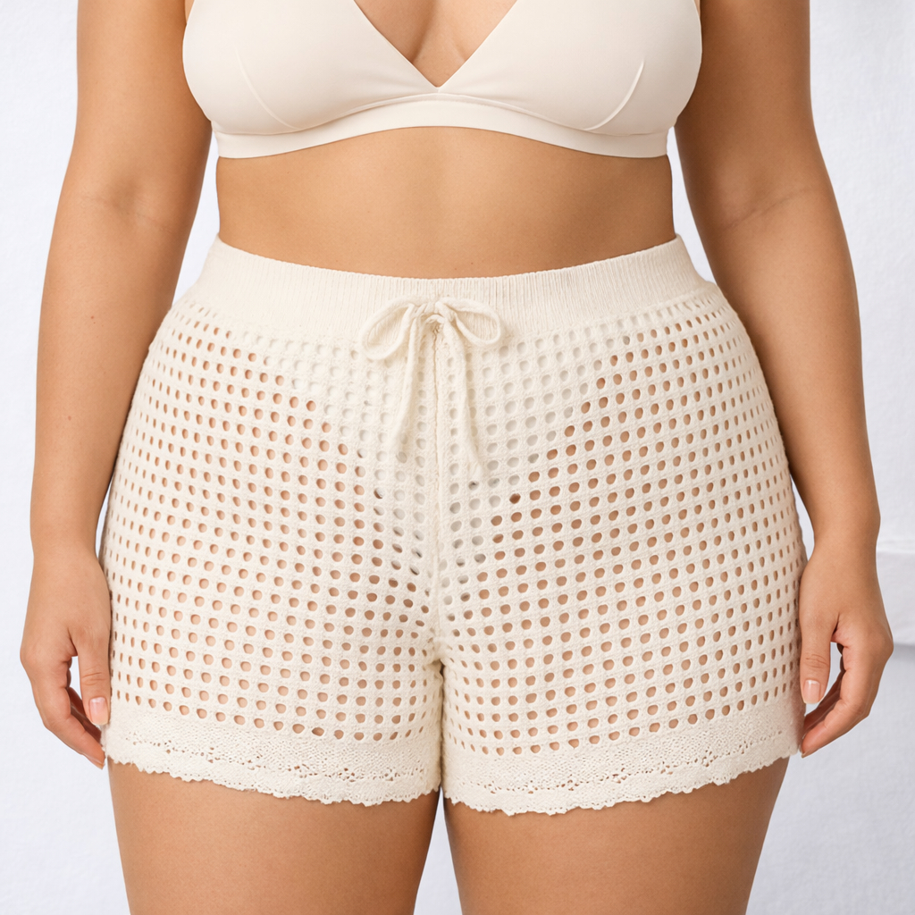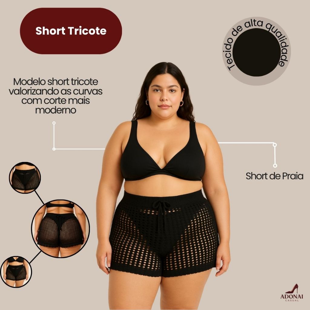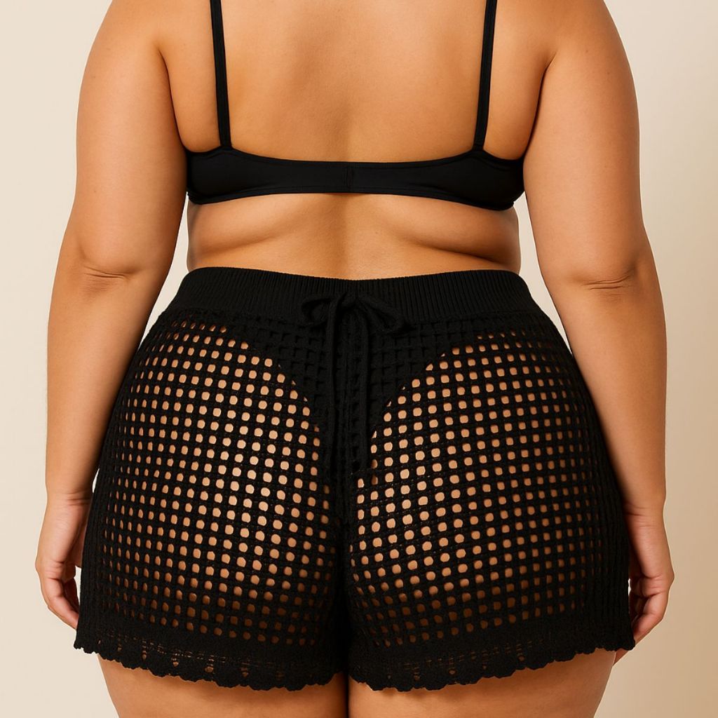 Short Feminino Tricô Vazado Plus Size com Amarração Confortável Estilo Sofisticado Envio Imediato