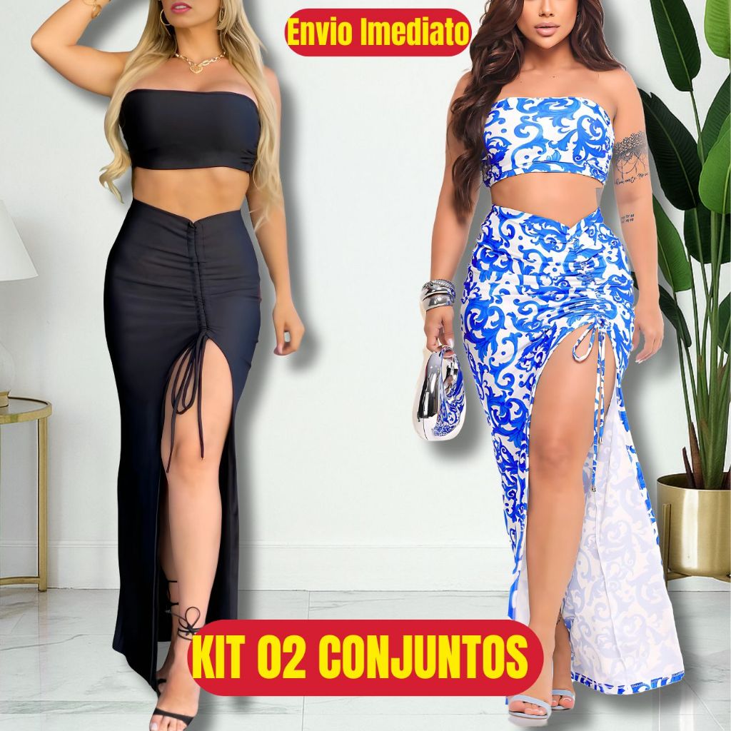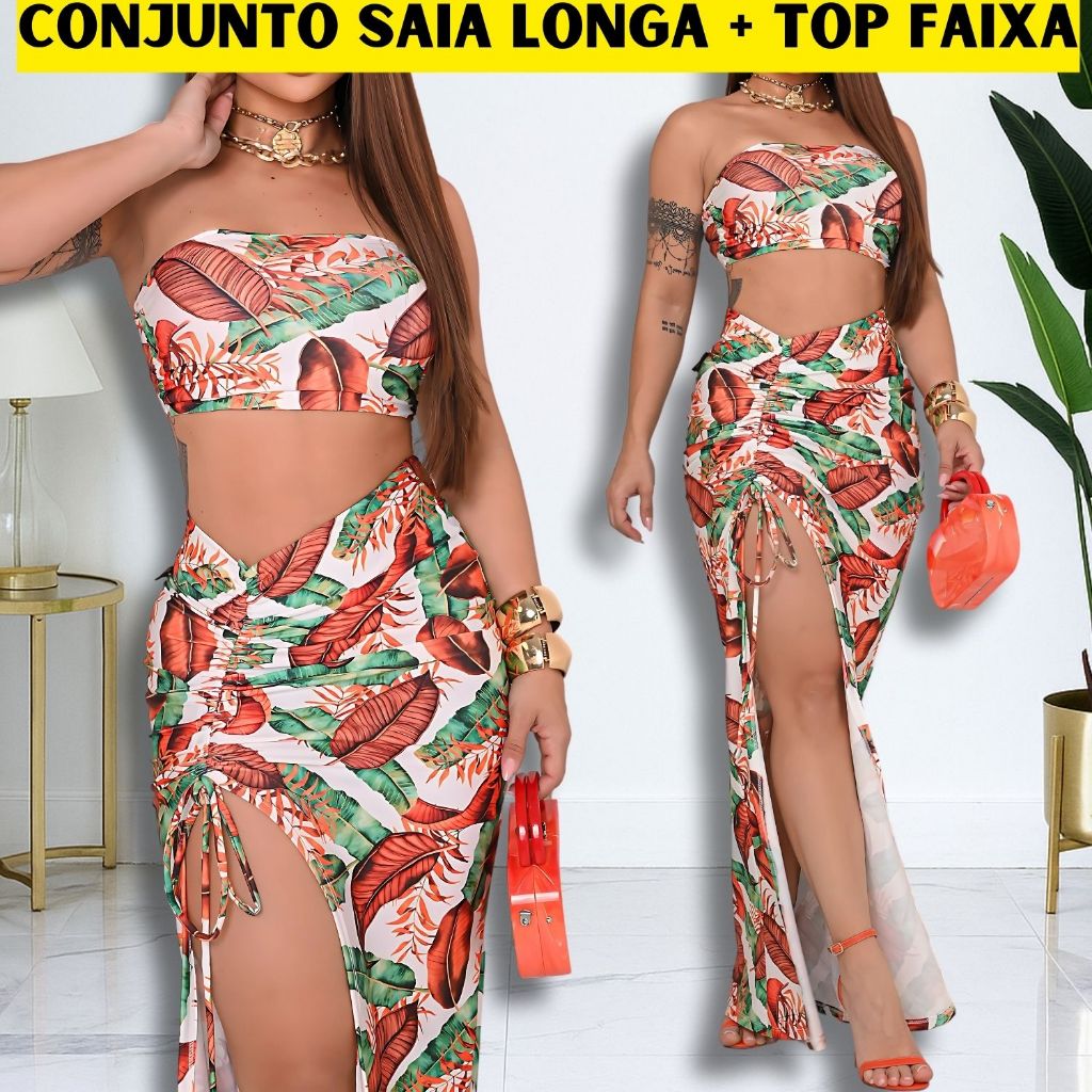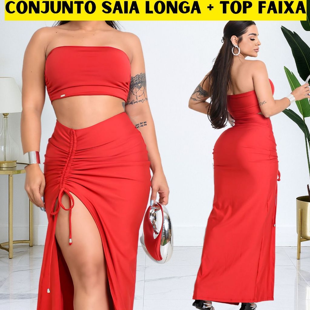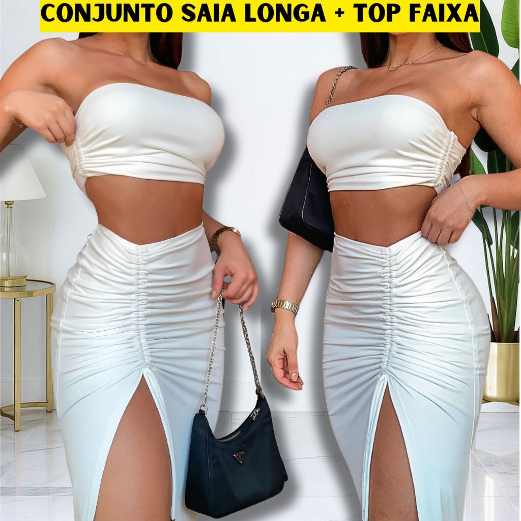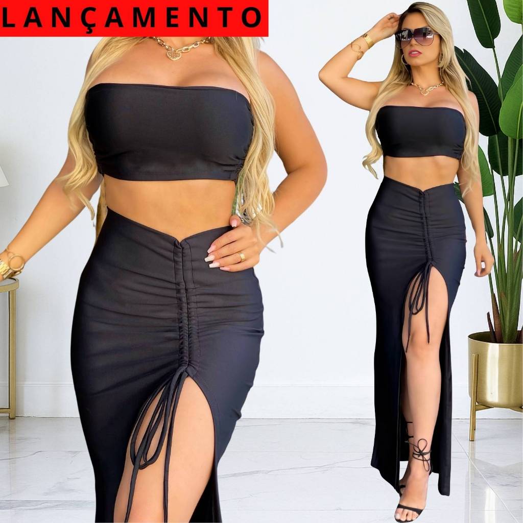 Conjunto Saia Longa Fenda e Cropped Top Faixa Feminina Modinha TENDÊNCIA Luxo