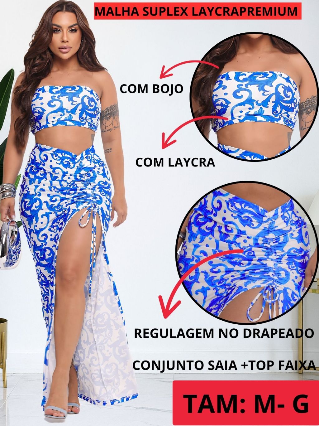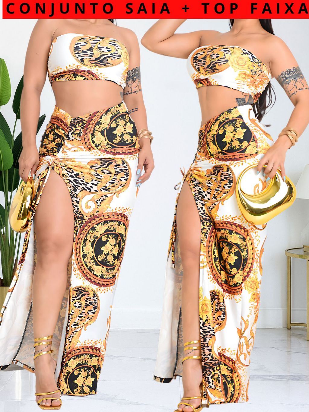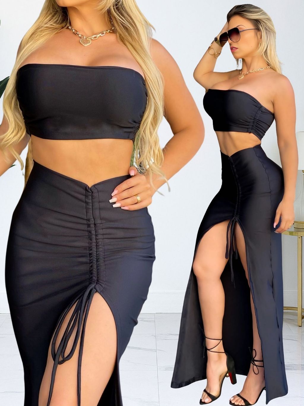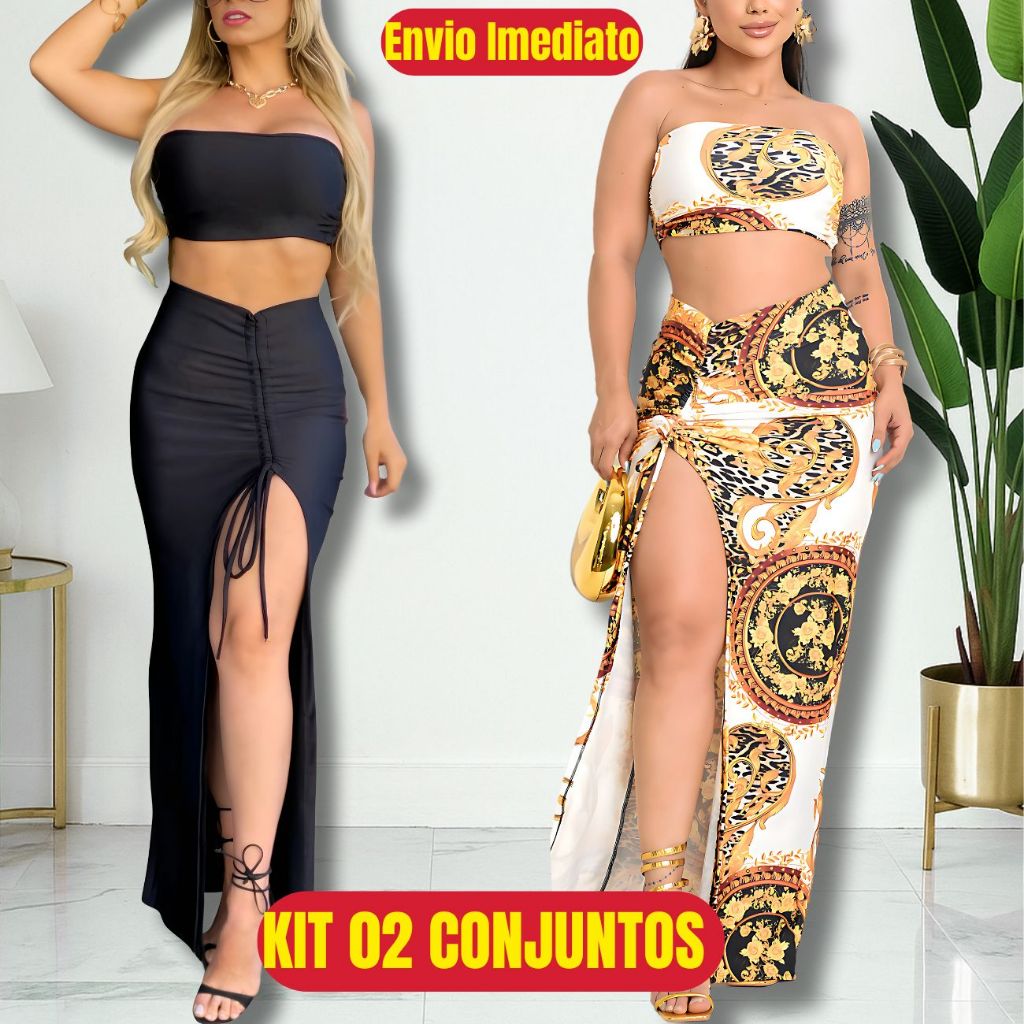 Conjunto Saia Longa Fenda e Cropped Top Faixa Feminina Modinha TENDÊNCIA Luxo