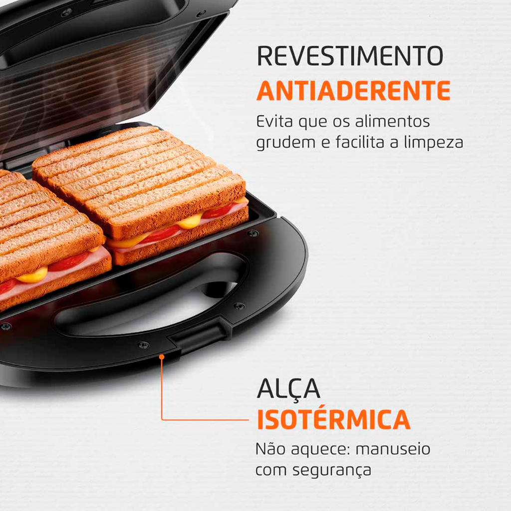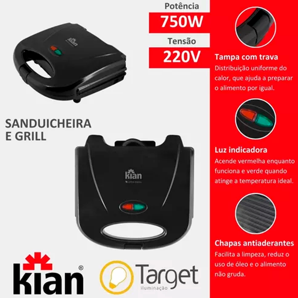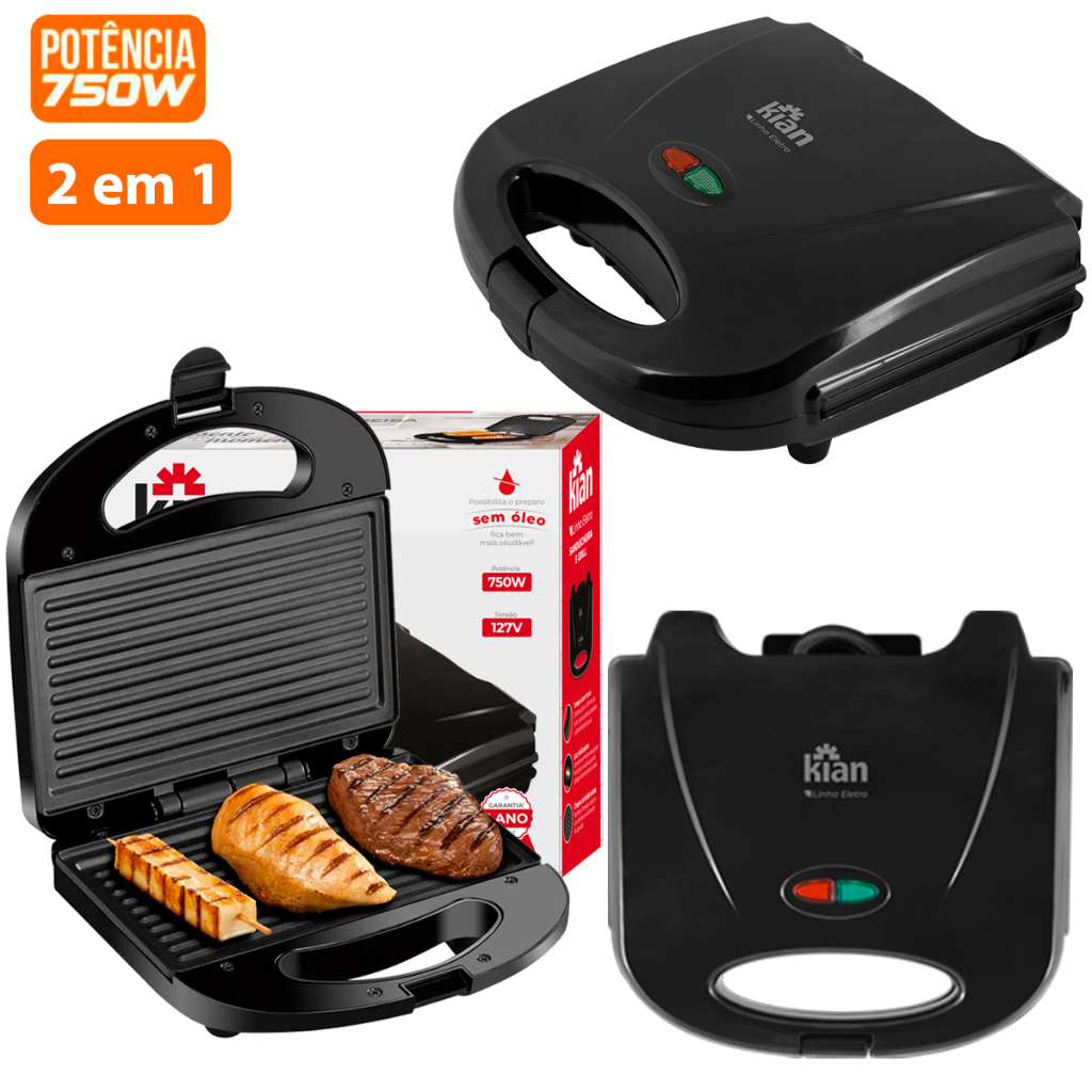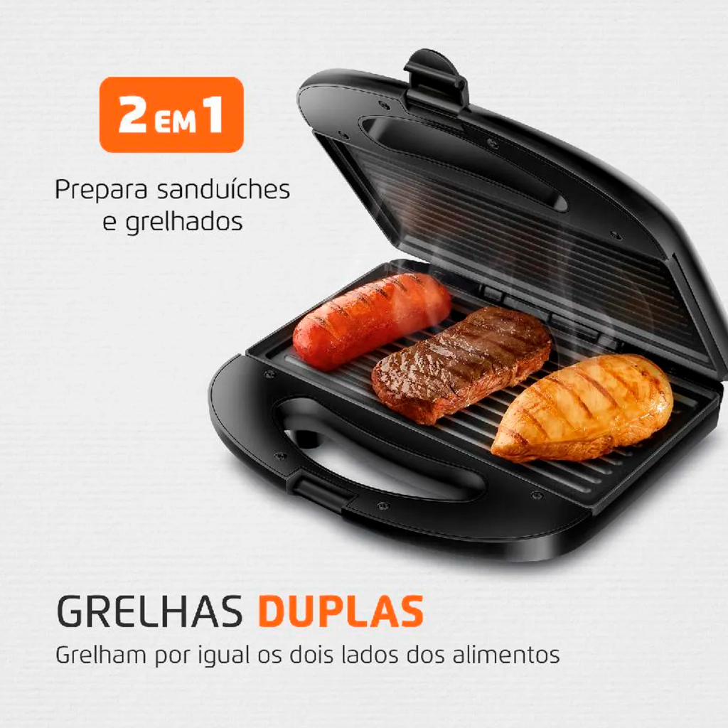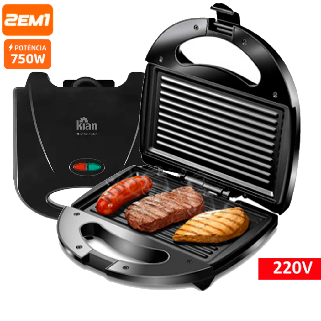 Sanduicheira Antiaderente Grill 2 em 1 Preta - vermelha Elétrica 750w 127V / 220V Automatica Premium
