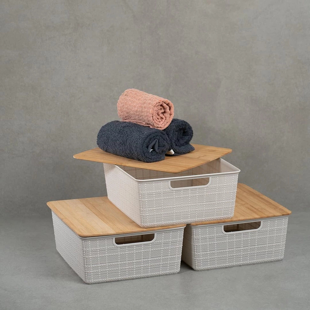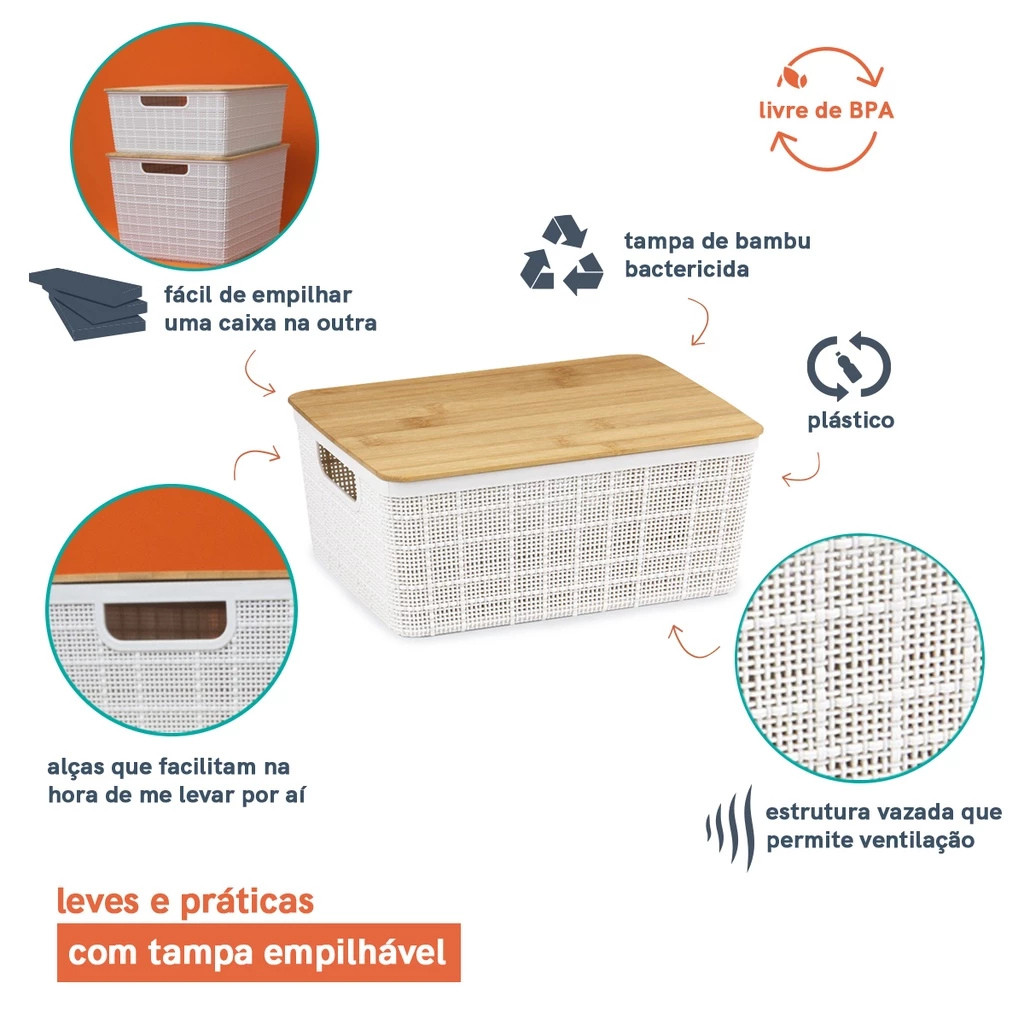 Kit 3 Caixas Organizadoras Tampa De Bambu Multiuso Branca 12L - Oikos
