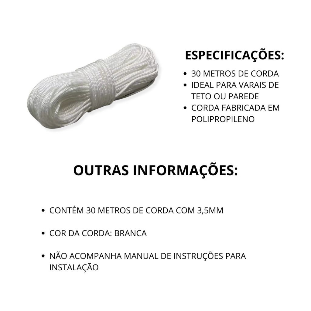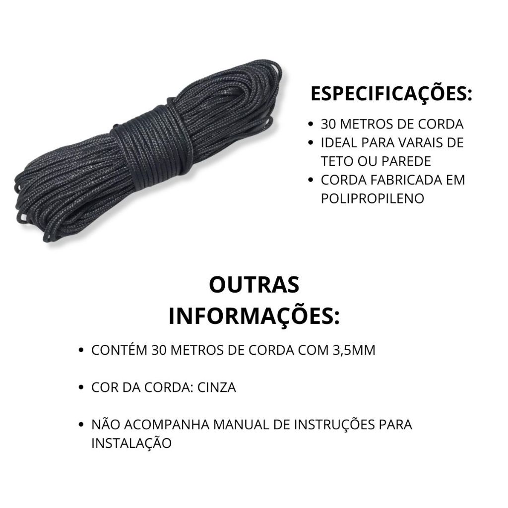 30 metros de corda Branca ou Cinza para Varal de Teto ou Parede Polipropileno 3,5mm