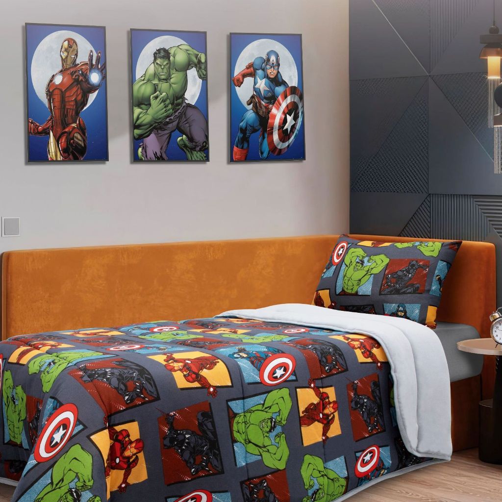 Edredom e Fronha Avengers Vingadores Marvel Disney Solteiro 2 pçs Kit Dupla Face Cobre Leito