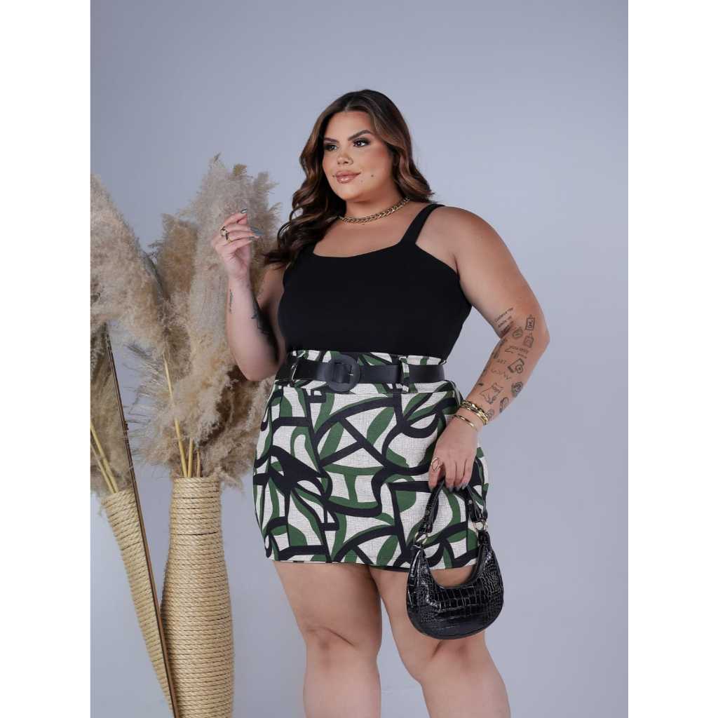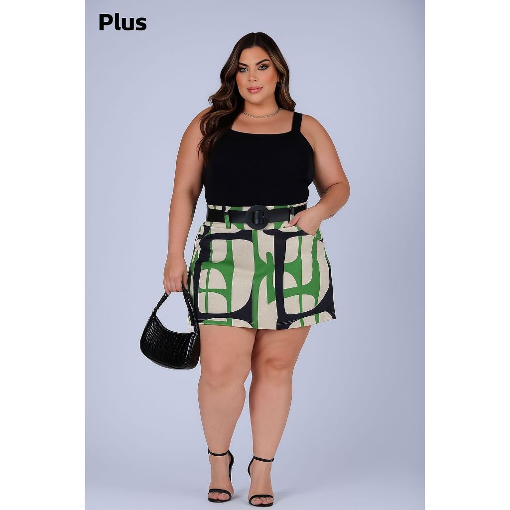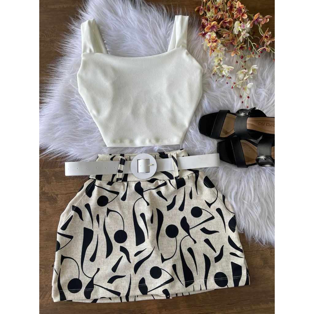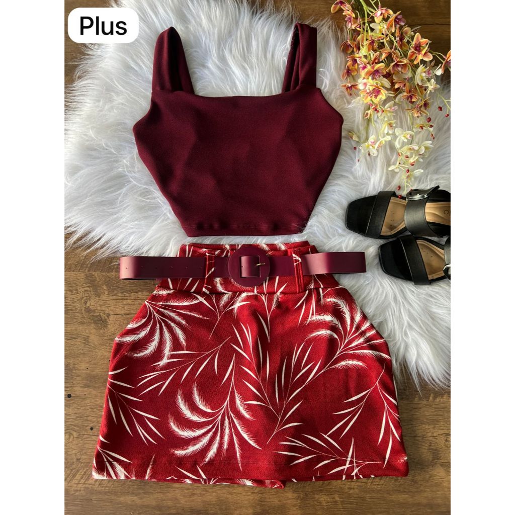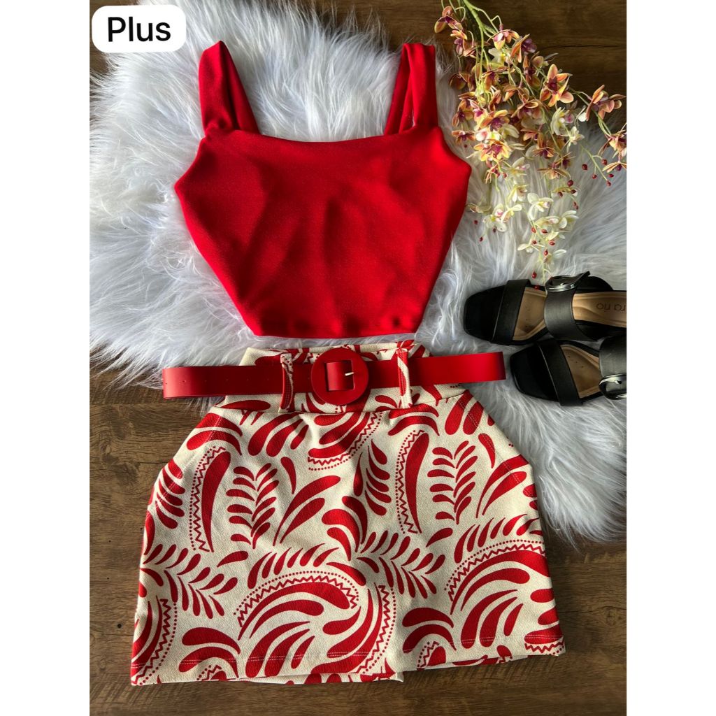 Conjunto Feminino Blusa Cropped + Short Saia Com Cinto Plus Size -Conjuntinho Plus Curve