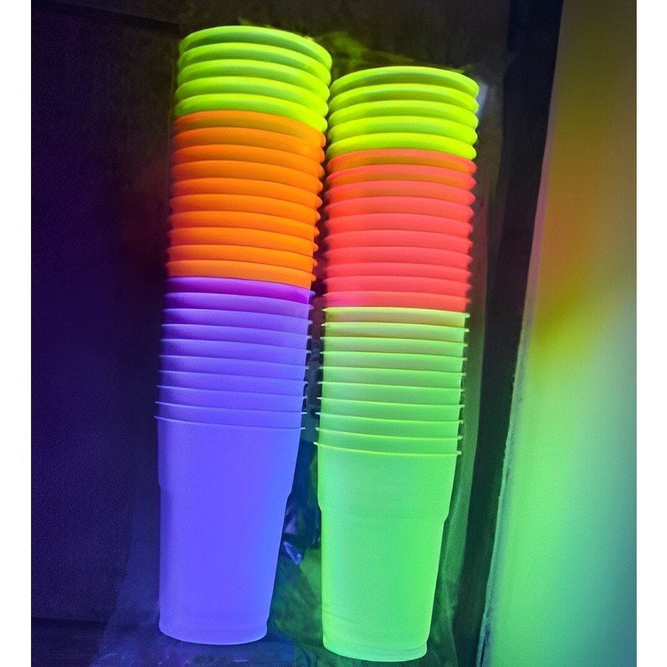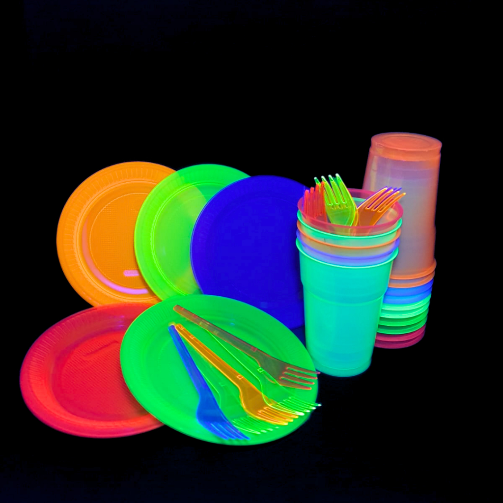 Kit Festa Neon 50 Copos 300 ml + 50 Pratos 15cm + 50 Garfinhos + 40 Canudos Brilha na Luz Negra