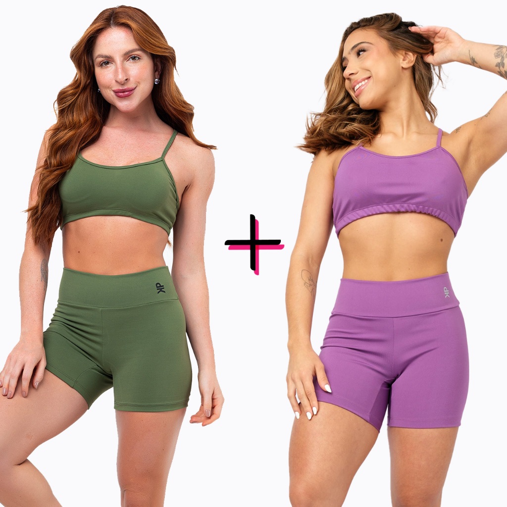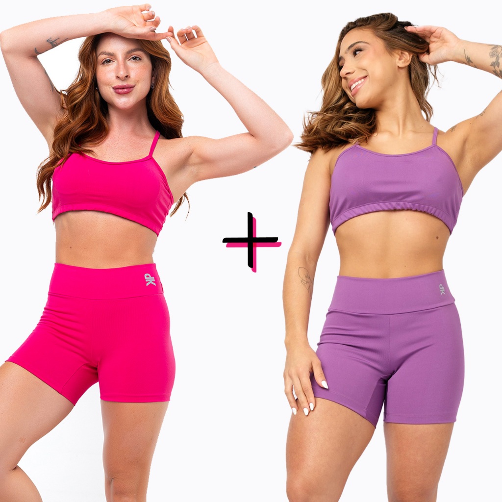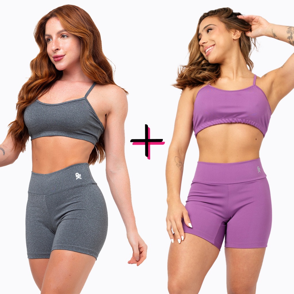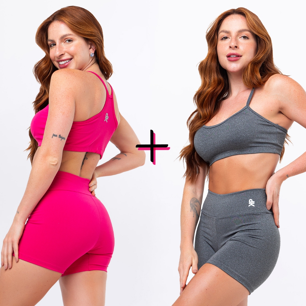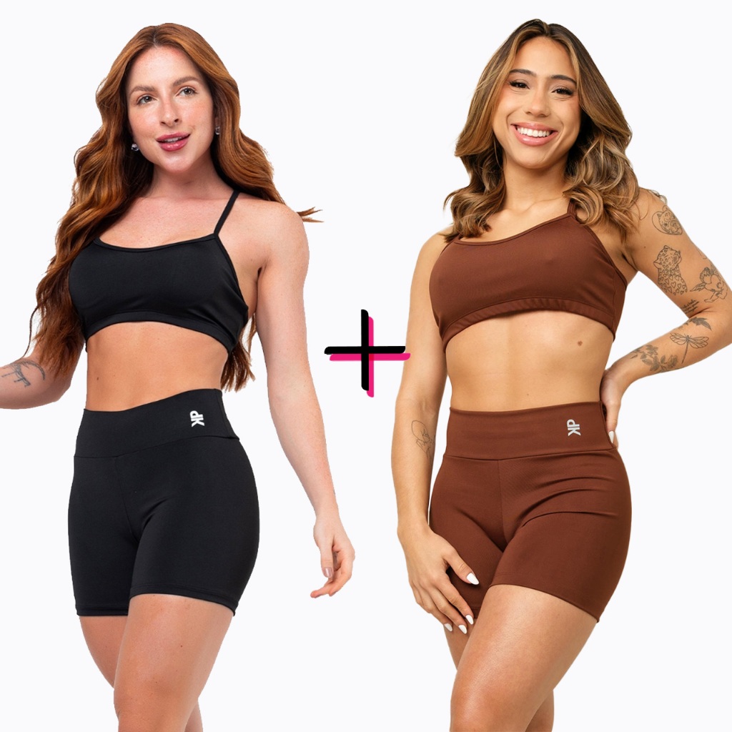 Kit 2 Conjunto Fitness Top Alça Short Legging Liso Meia Coxa Blackout Zero Transparência Academia