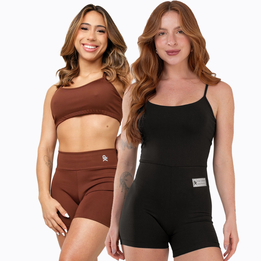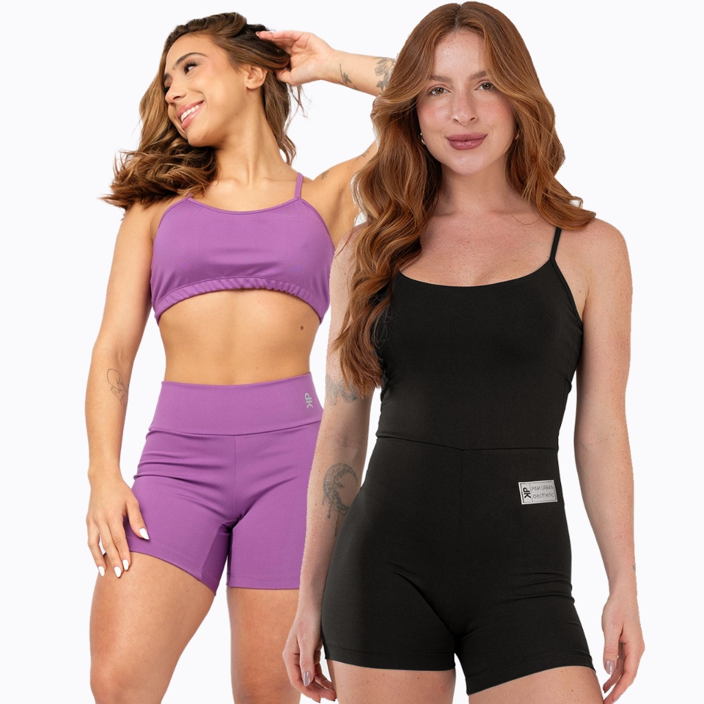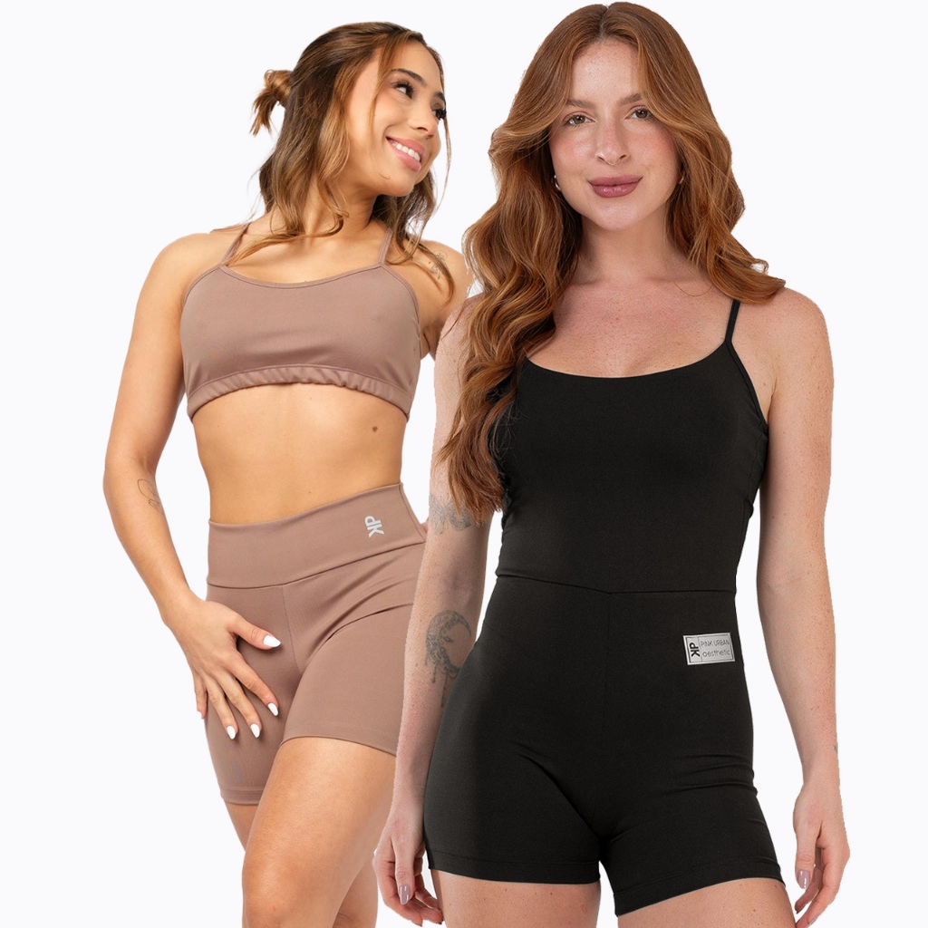 Kit Macaquinho Alcinha Costa Nua + Conjunto Fitness Top Alça Short Meia Coxa Zero Transparência