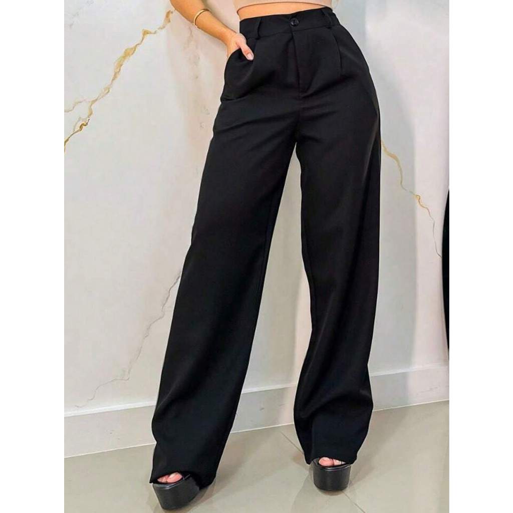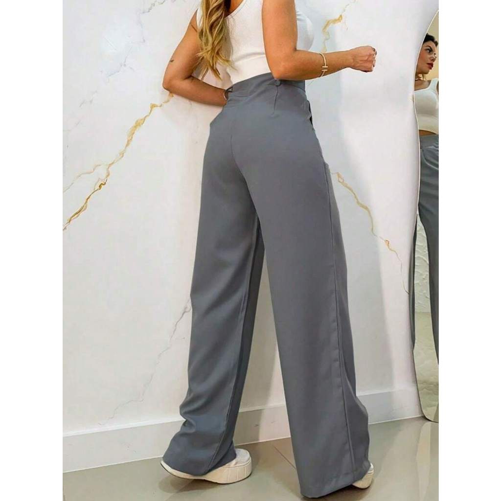 Calça Pantalona Feminina Alfataria com Botão e Ziper Wide Leg