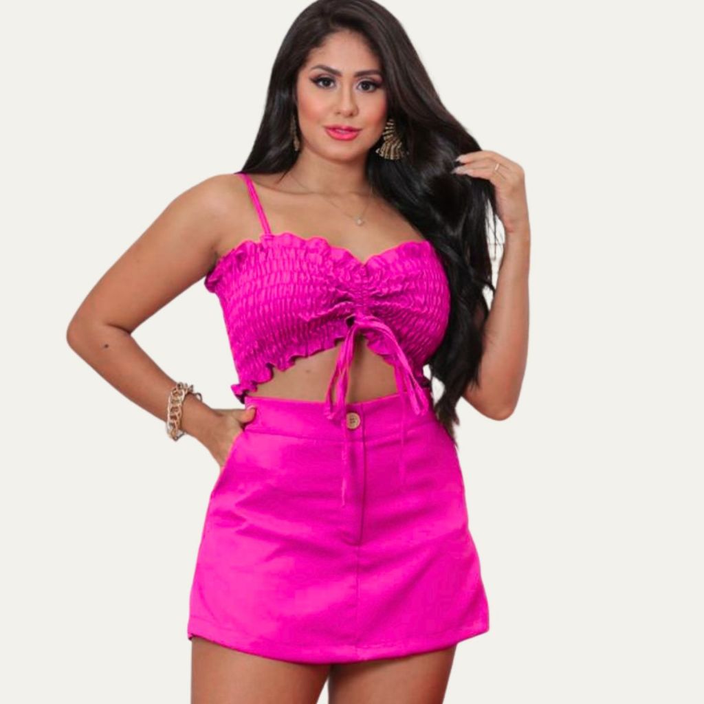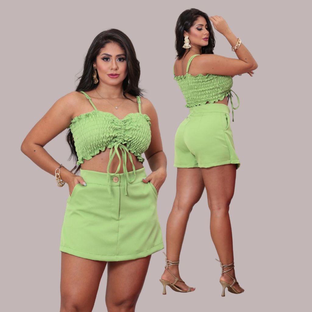 Conjunto Feminino Short Saia e Cropped Lastex Alfaiataria Cintura Alta Elegante Com Bolso Luxo Verão
