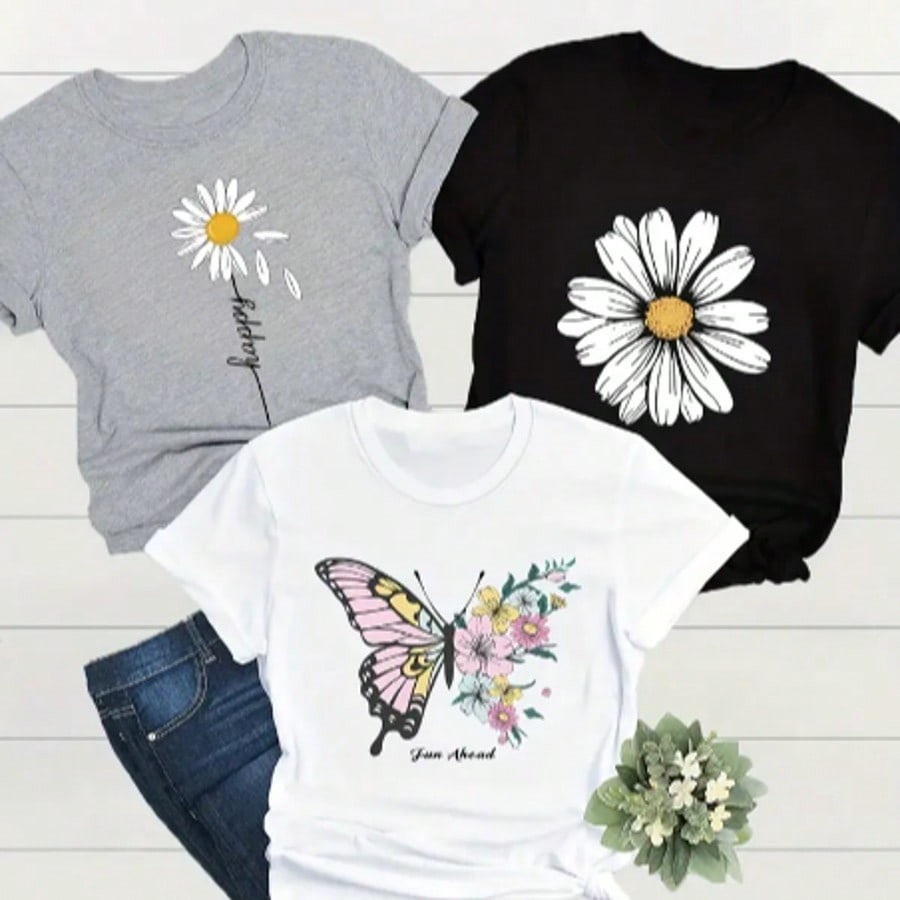 Kit 3 Tshirts blusas de algodão Camisetas Femininas Casuais com Estampa de Flores e Borboletas