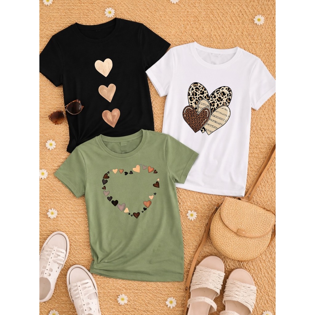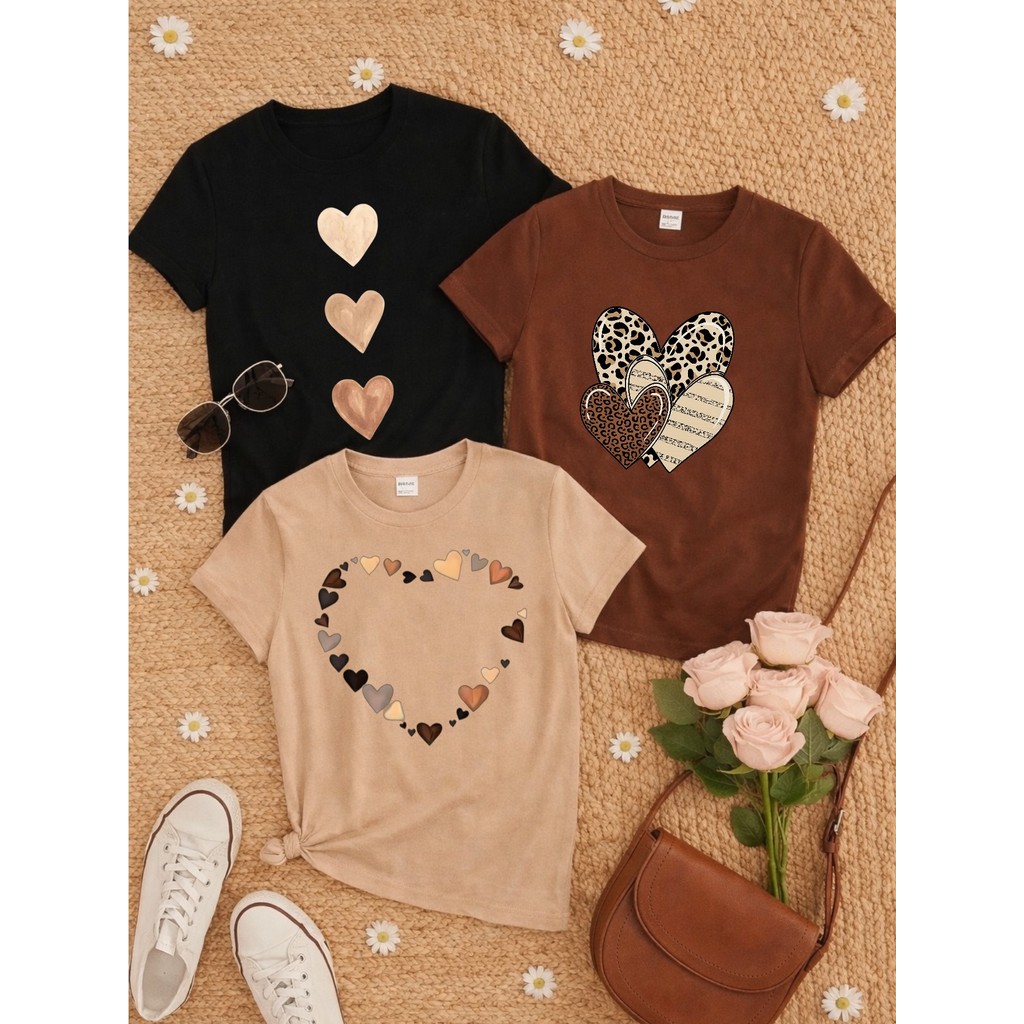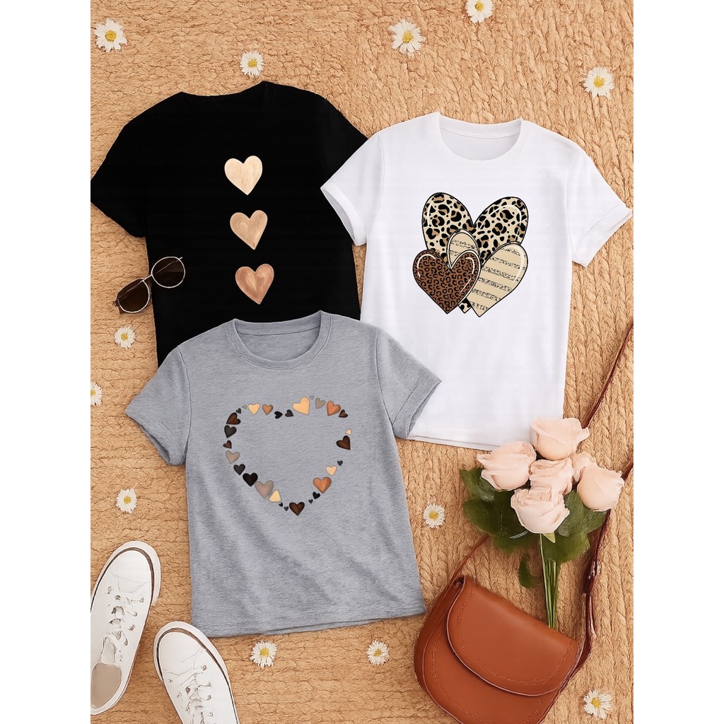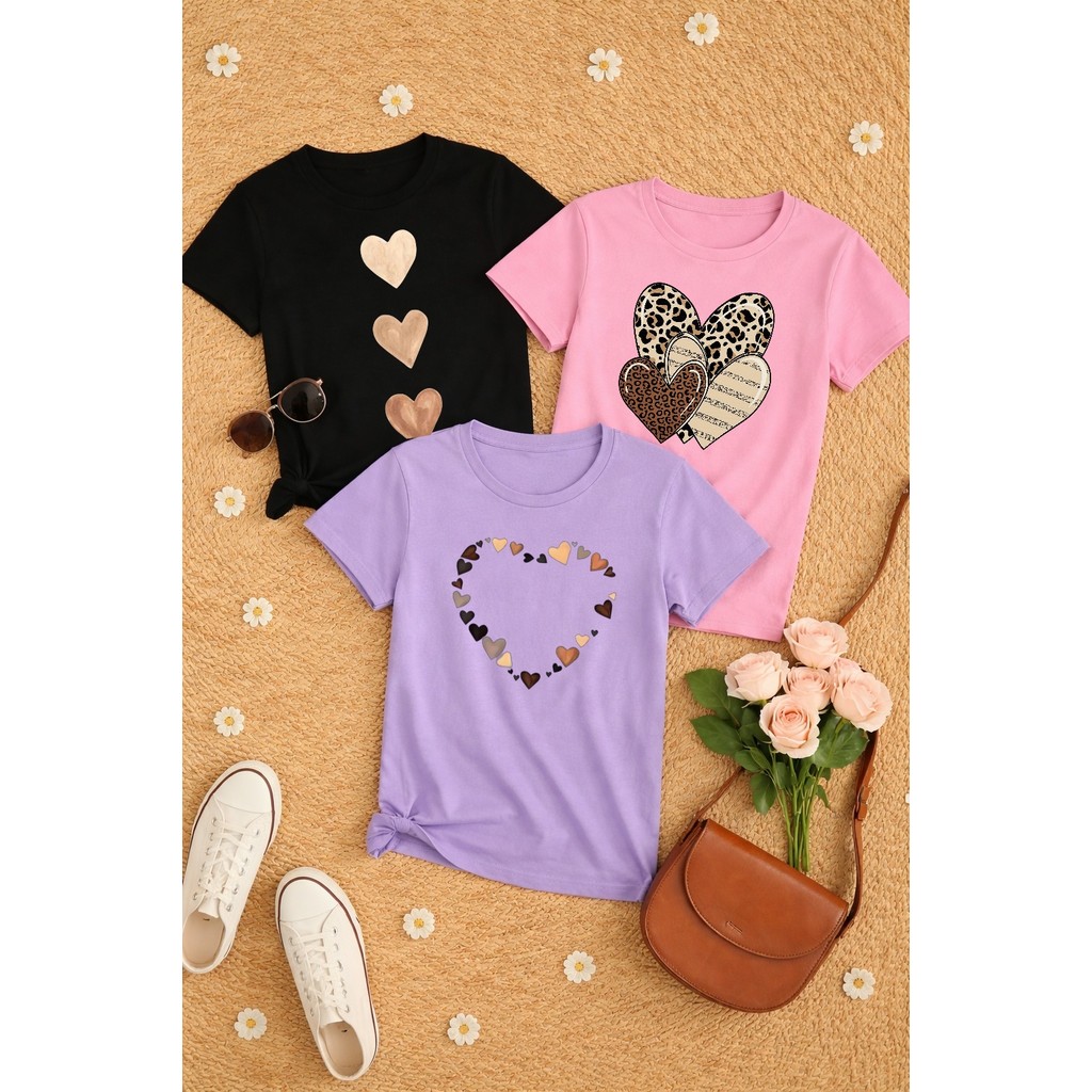 Kit 3 Blusas Femininas 100% Algodão – Confortáveis, Macias, Estampas de Coração, Casual e Moderna