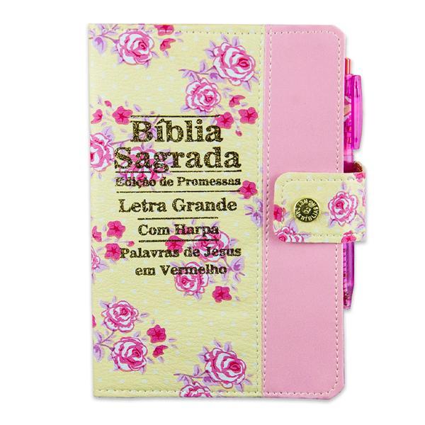 Bíblia Letra Grande Floral e Rosa com Fechamento em Botão e Harpa