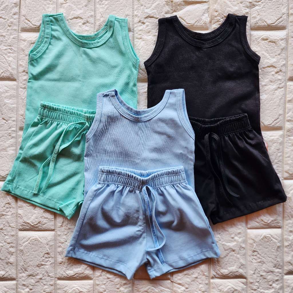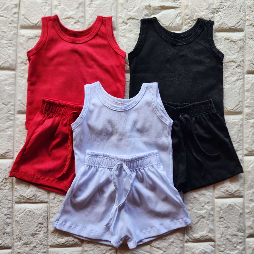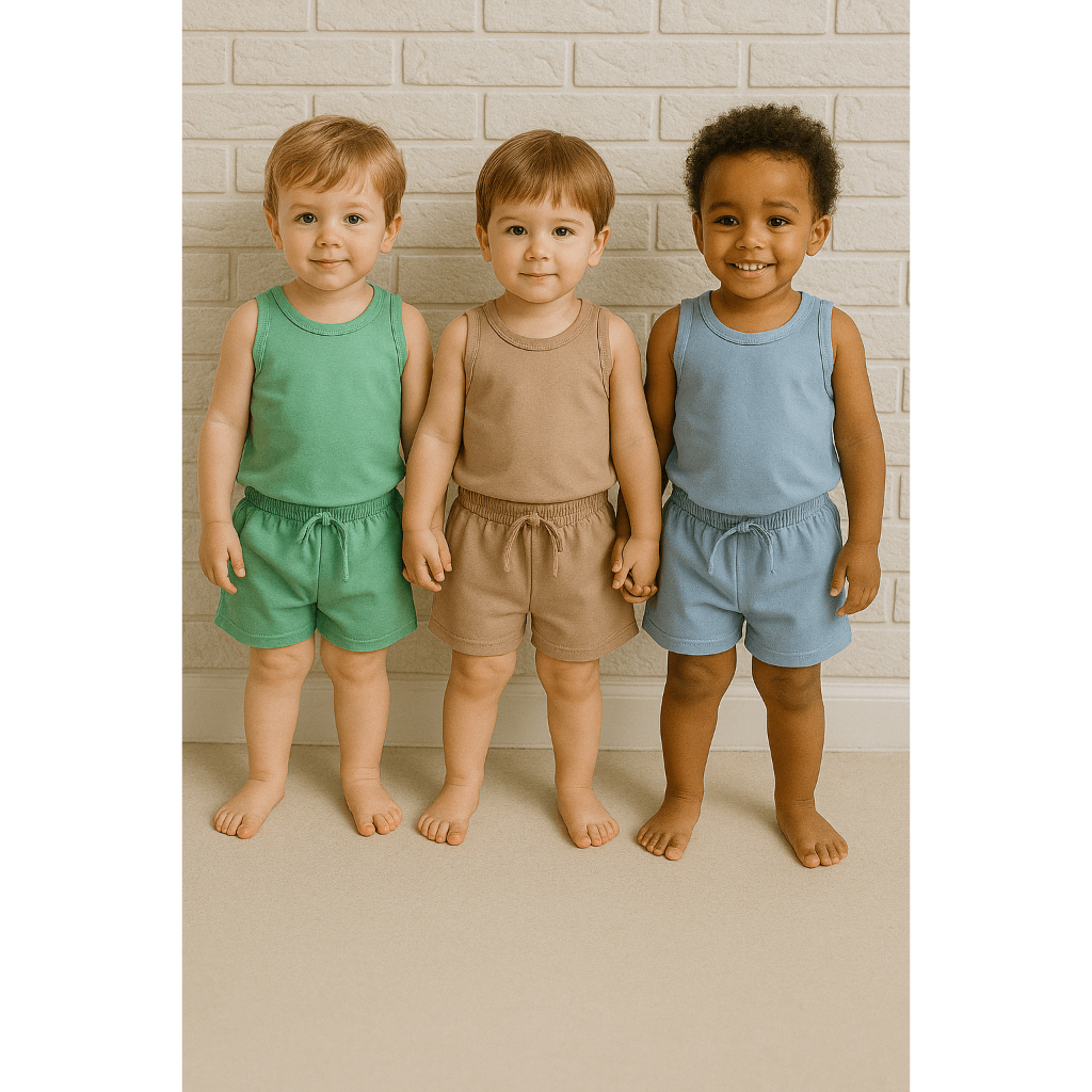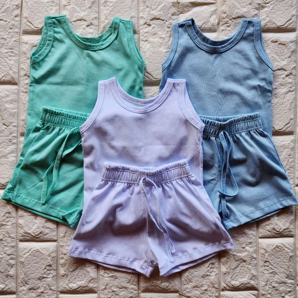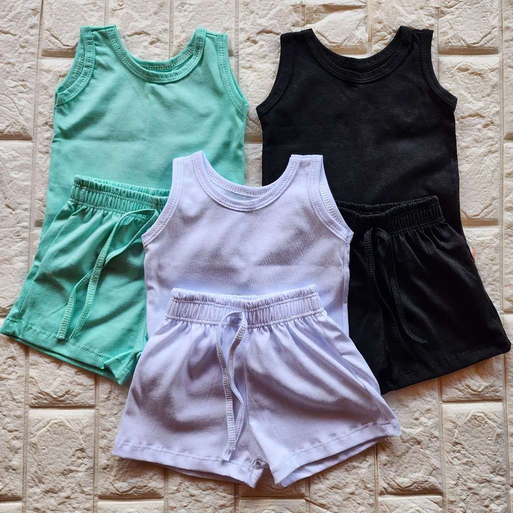 KIT 3 CONJUNTO INFANTIL 6 PEÇAS CAMISETA REGATA E SHORT BEBÊ MENINO MENINA BÁSICO LISO VERÃO