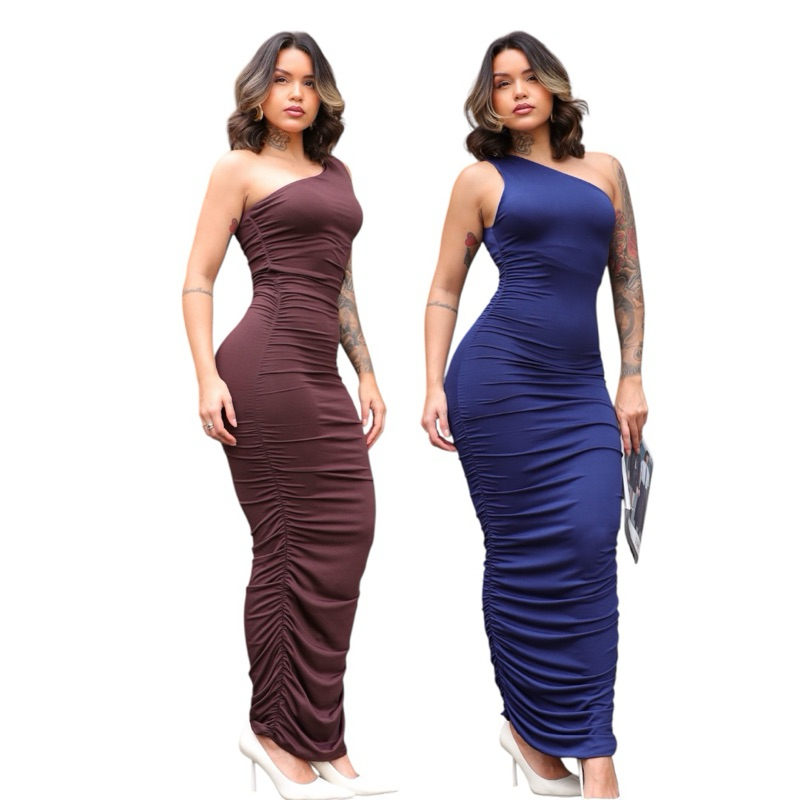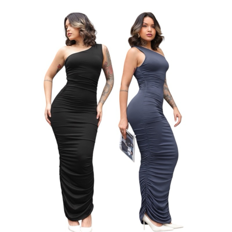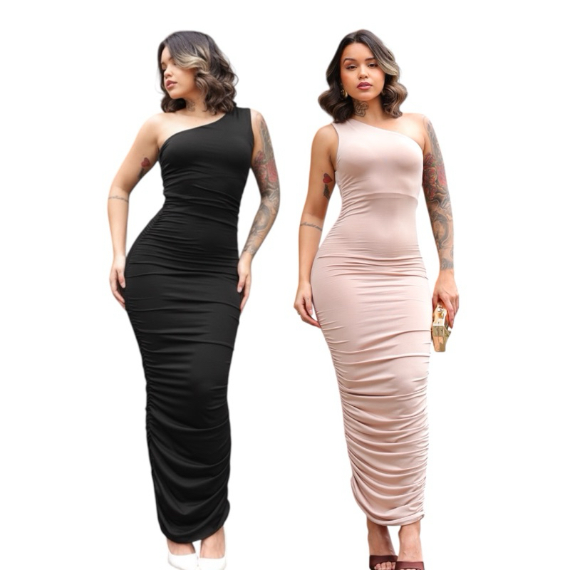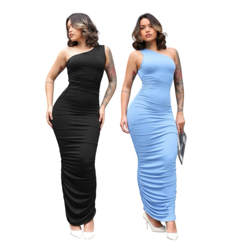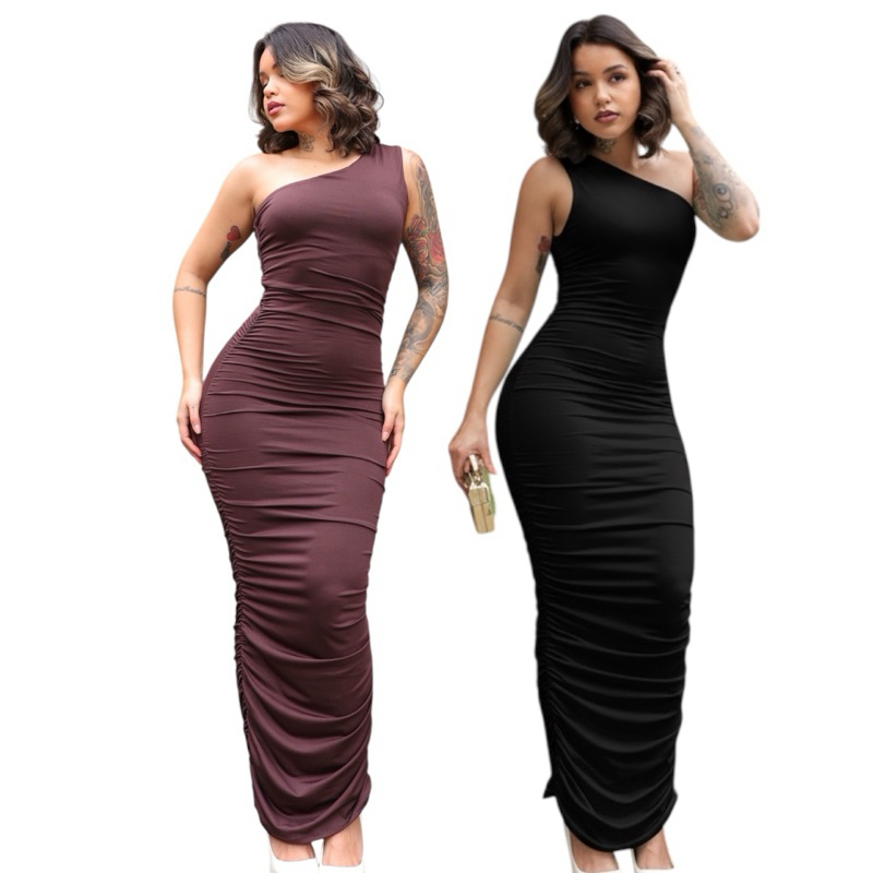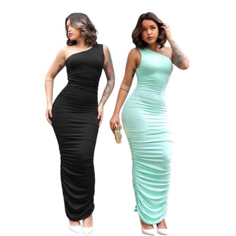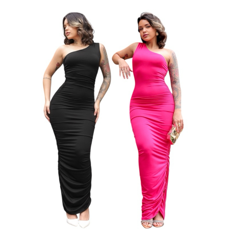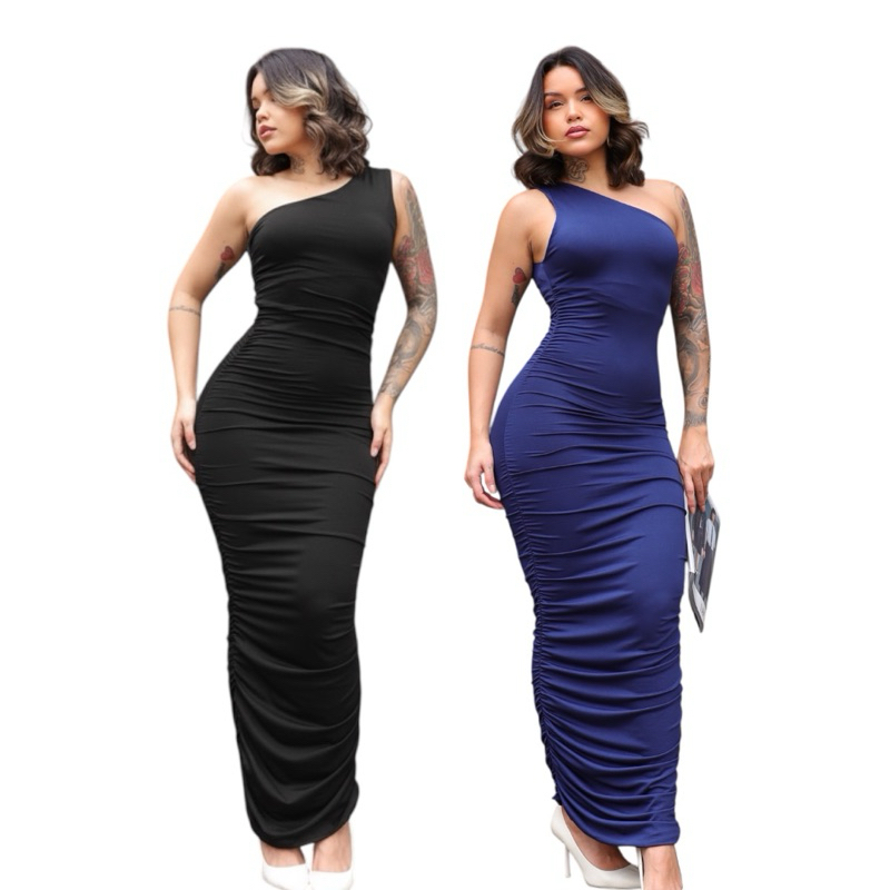 Kit 2 Vestido Longo Feminino Franzido Drapeado um ombro só