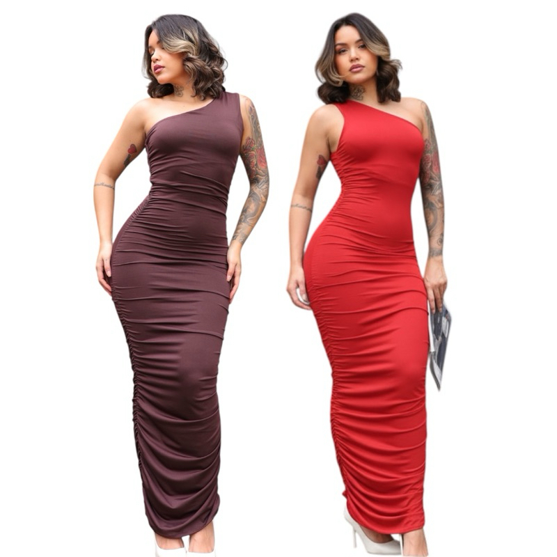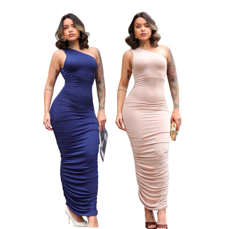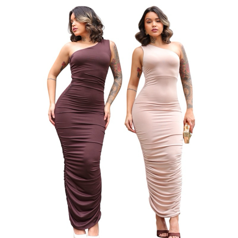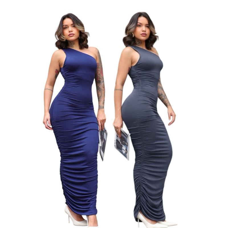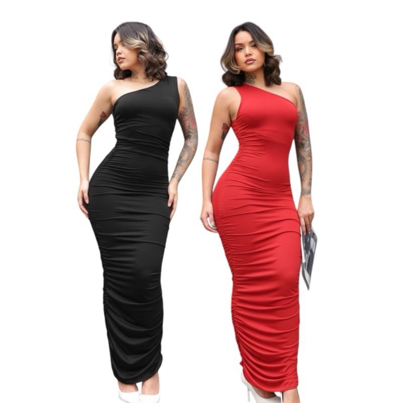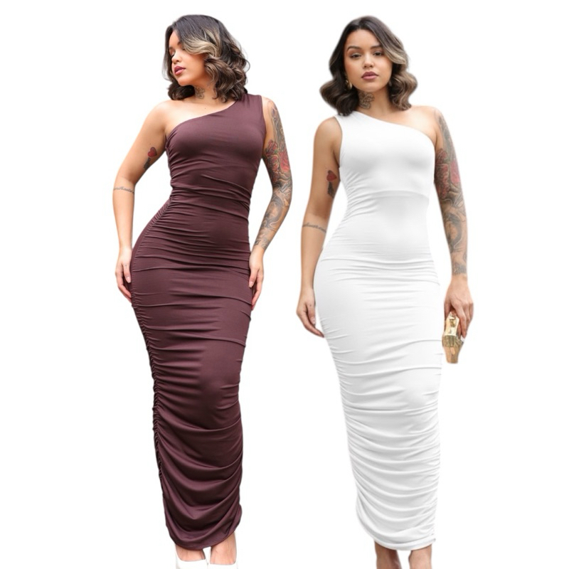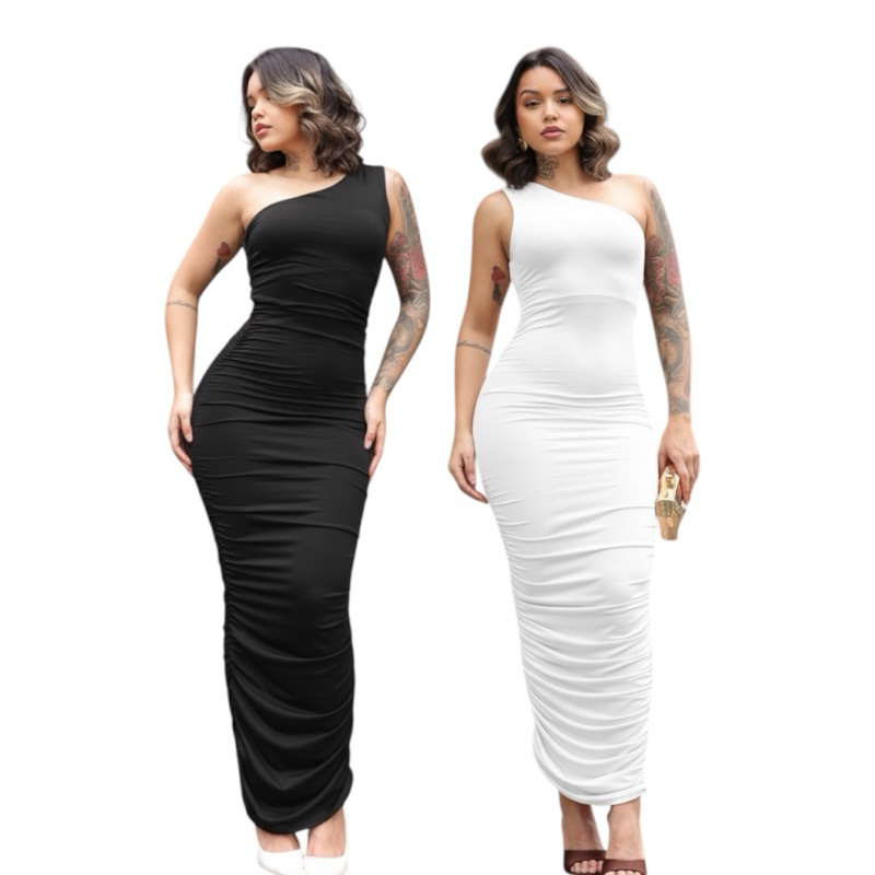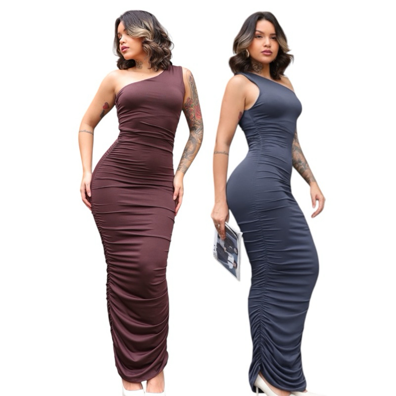 Kit 2 Vestido Longo Feminino Franzido Drapeado um ombro só